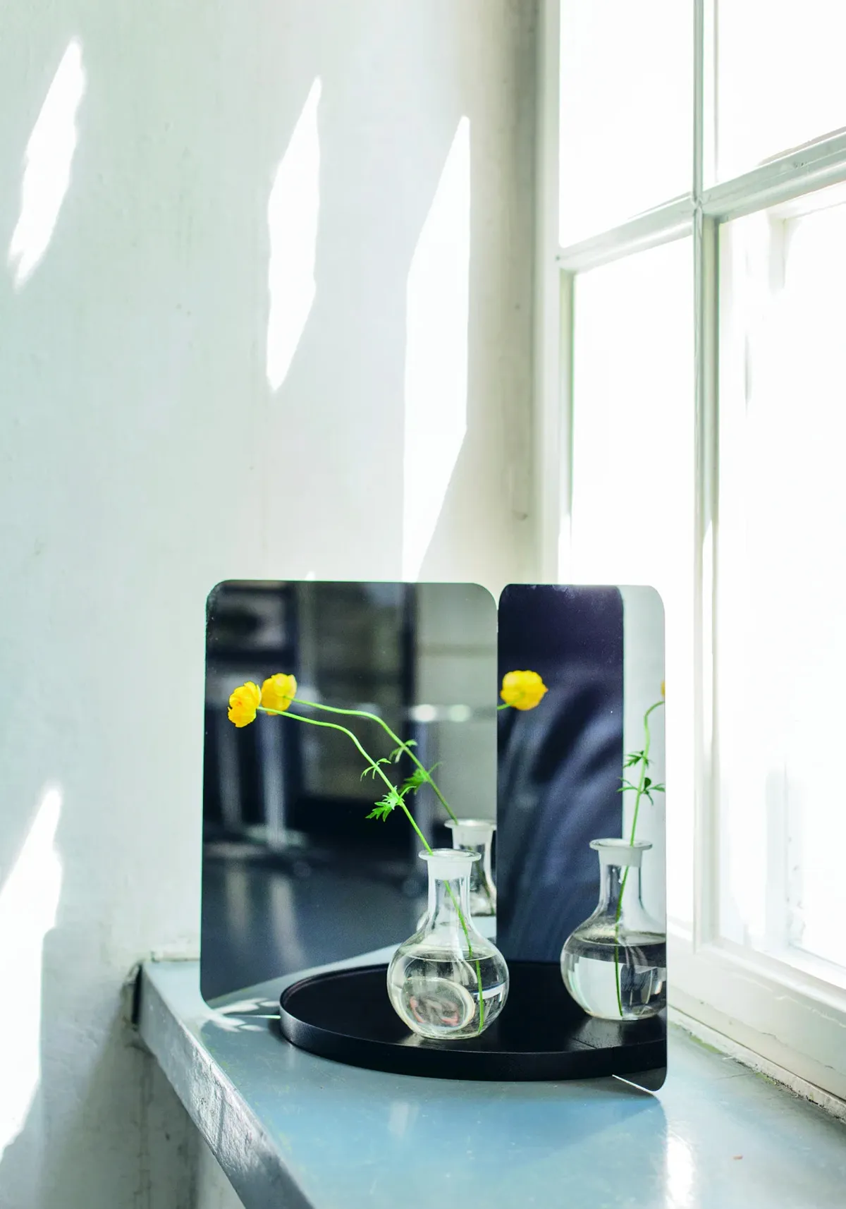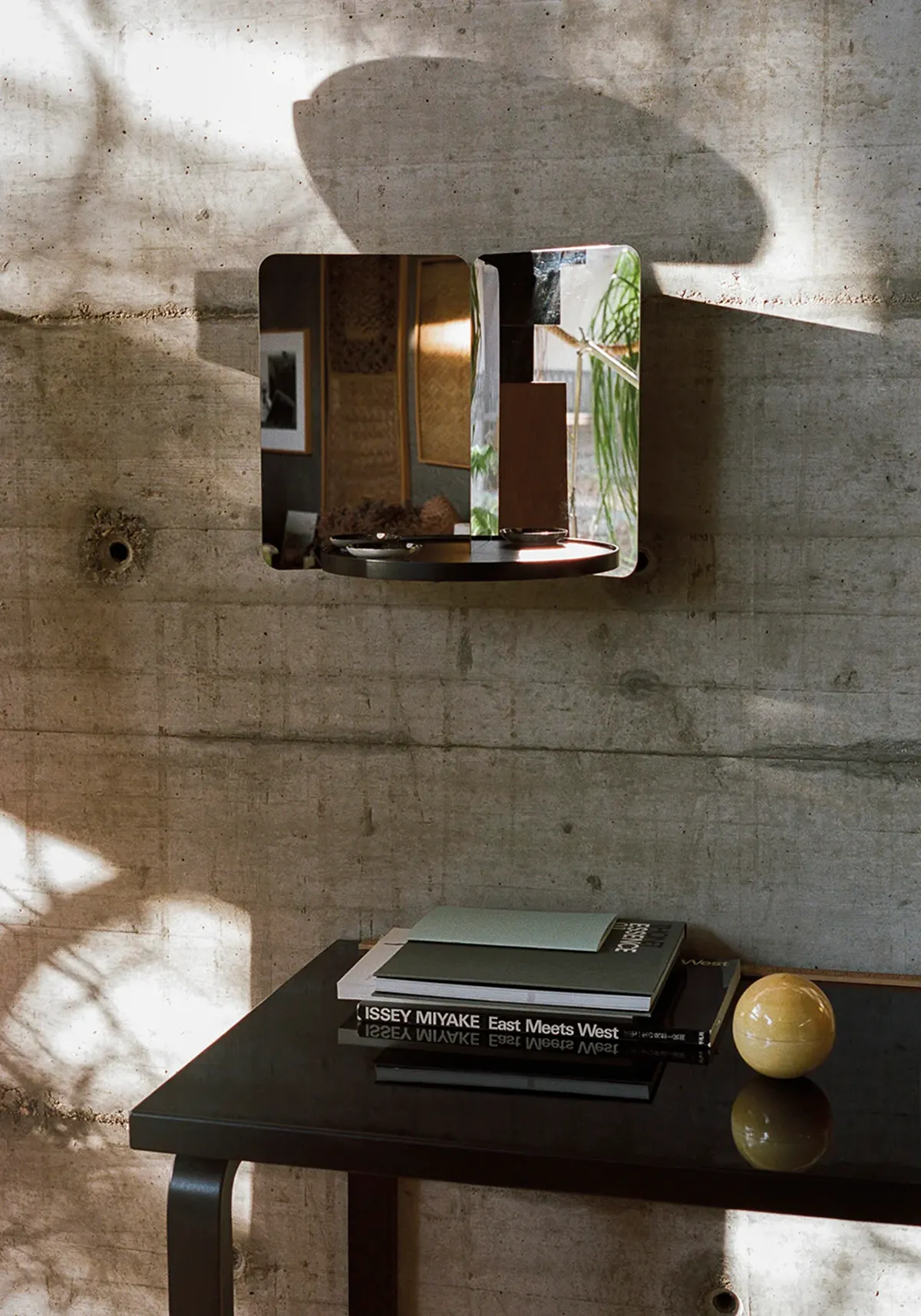 The 124° wall-mounted mirrors have an unmistakable sculptural quality. Two faces are placed 124 degrees apart creating an unexpected dual-aspect reflection of the surrounding space. The mirrors are functional objects designed for use, made from mirror polished sheet steel, and are available in three different variations including one with an integrated wooden shelf. They are also an evolution of Rybakken’ s extensive work around the subjects of natural light and image and as such they punctuate the wall with their strong form, curious reflected image and fragments of refracted light. The mirrors have endless applications; they might be hung in a hallway, bedroom, bathroom or on any wall that might be enhanced by their form and qualities, alternatively they can be used freestanding on a table, shelf or horizontal surface.