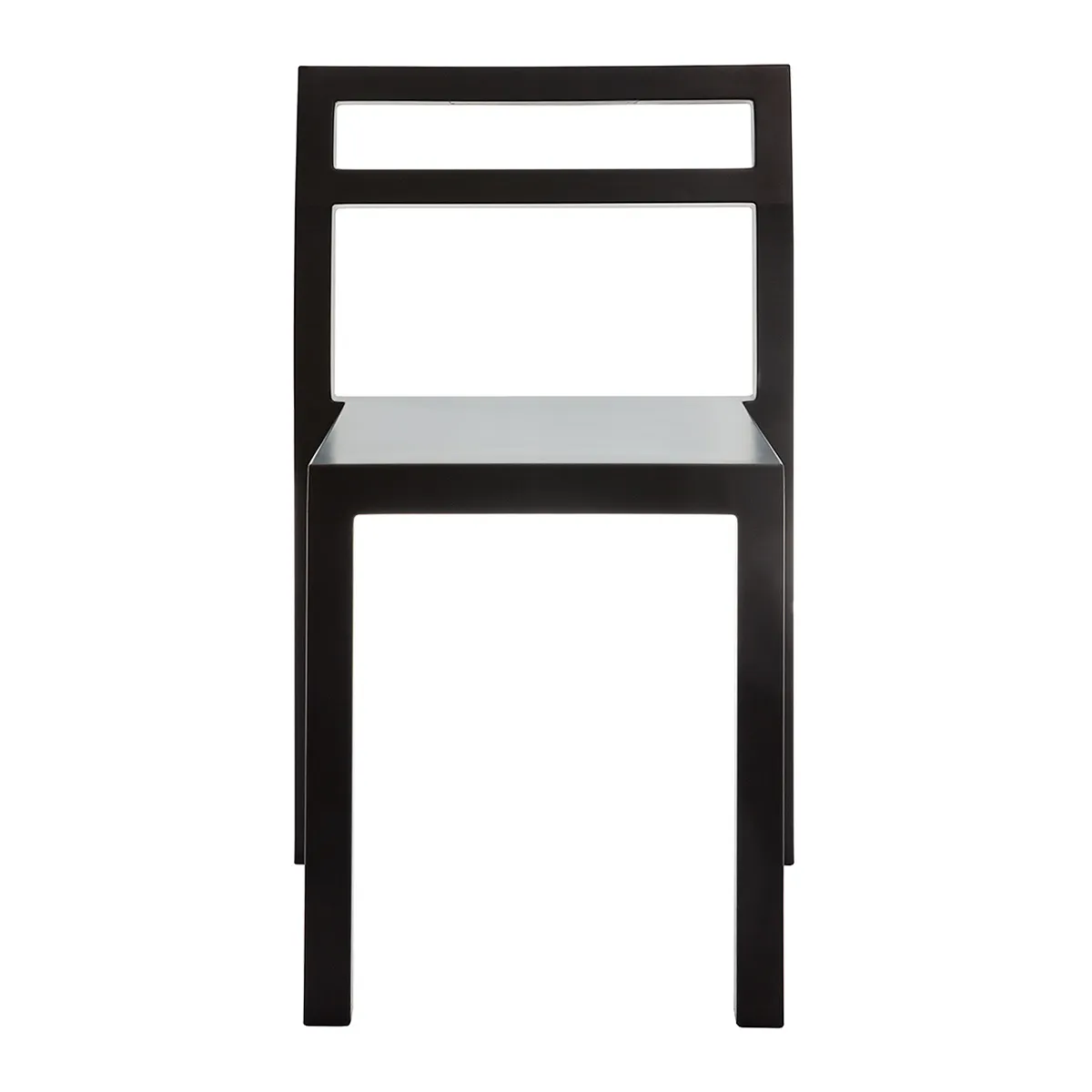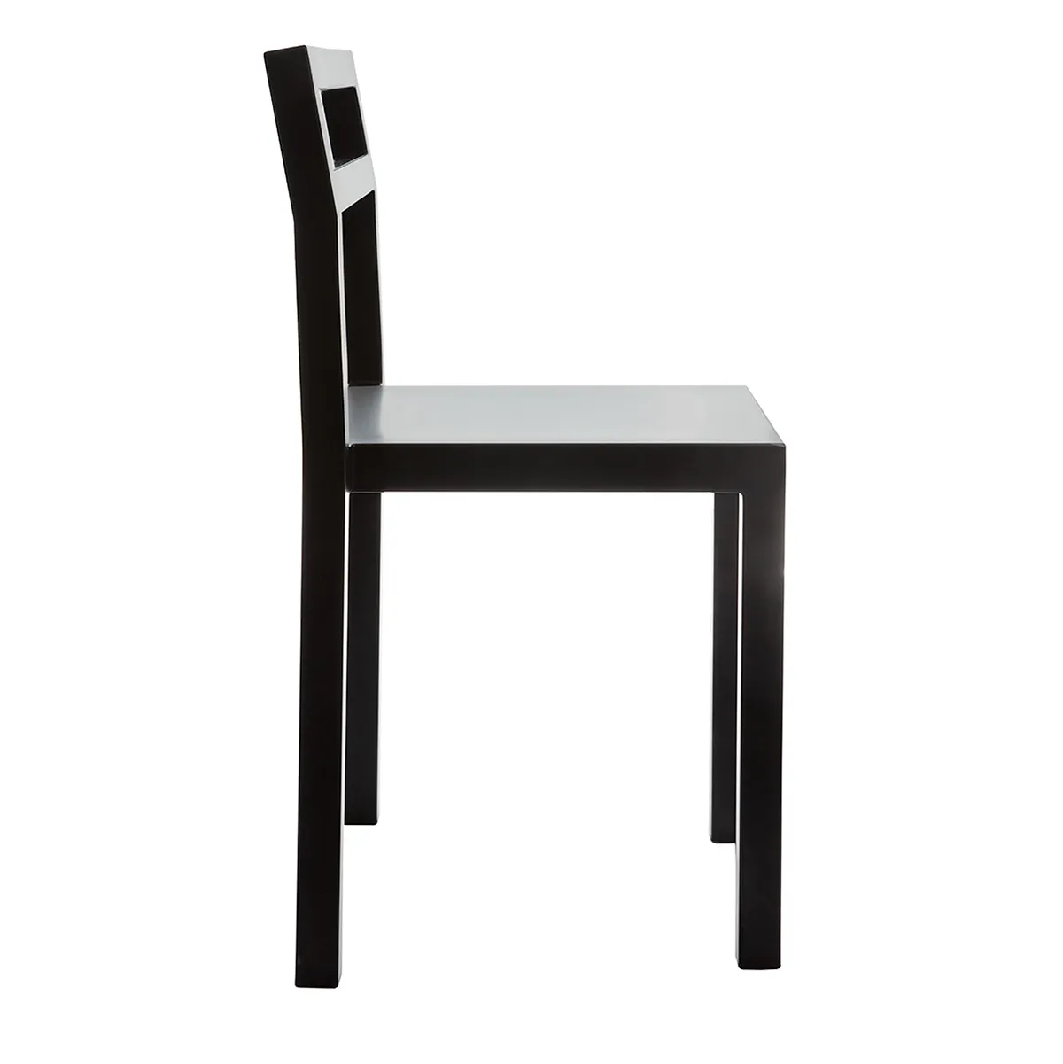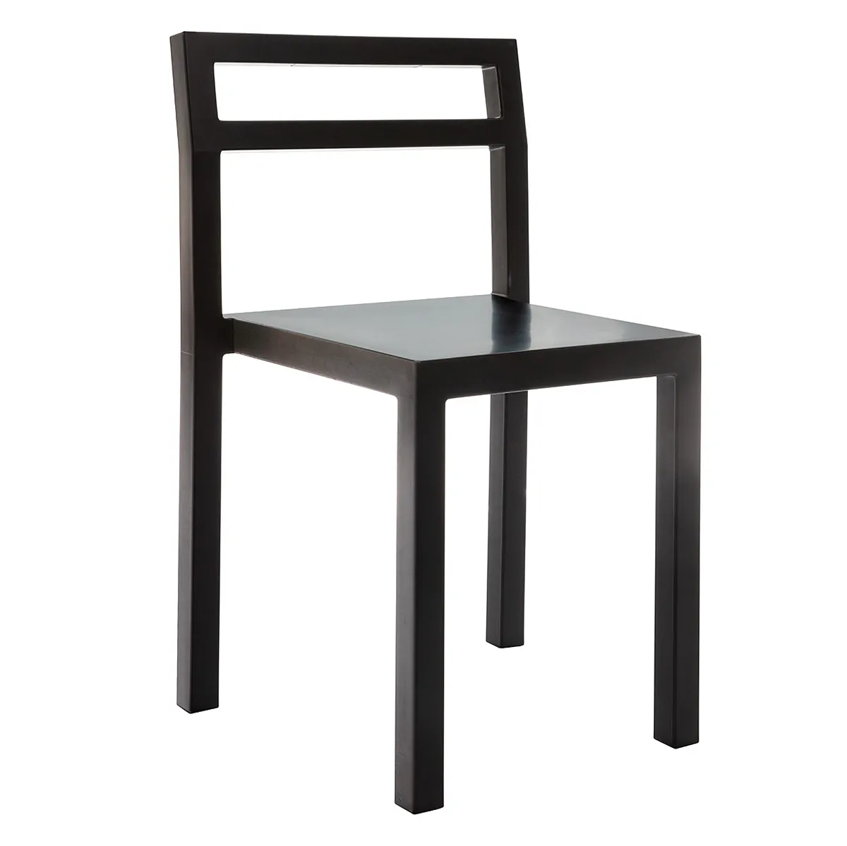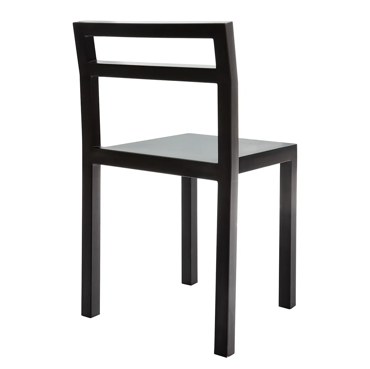 The NON chair features a tubular steel frame with PUR rubber molded directly onto the structure in a single-shot monoblock process. This manufacturing approach allows for geometric precision while maintaining comfort through the inherent softness of rubber and integrated spring steel bands in the backrest. The chair measures 77 cm in height, 44 cm in width, and 39 cm in depth, with a seat height of 45 cm. The result is geometrically straight yet comfortable seating that defies the typical trade-off between minimalist aesthetics and ergonomic support.