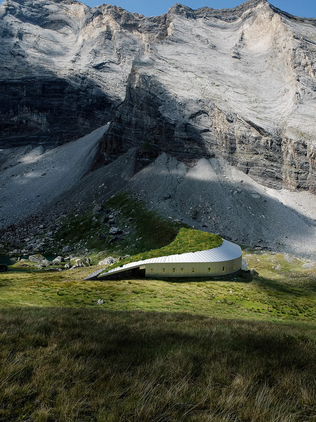 The refuge is characterised by its large planted roof, which follows the lines of the landscape, and its protective envelope made of recycled aluminium, which shelters the outside spaces from the prevailing winds.