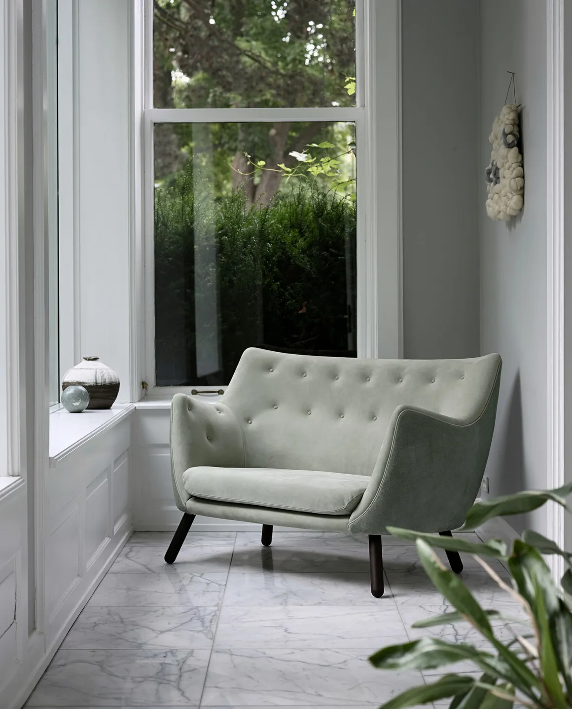 The small two-seater sofa was inspired by modern art and is characterized by exceptional comfort, traditional craftsmanship and materials of the highest quality. At the Cabinetmakers’ Guild Exhibition in 1941 the Poet was showcased next to two plaster sculptures by the artist Sigurjón Ólafsson. With the approach of an artist, Finn Juhl designed the sofa’s organic shape and managed to forge the relation between furniture and sculpture.