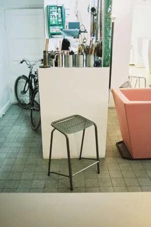 We have a creative studio that is family run. The place is a former dairy business, and at one time it was an upholstery workshop. We took over the space with everything it contained. We’ve kept some of it, because it’s fun to see what the space has been used for over time. It’s a playful place. Not very tidy, so inspiration can flow. It’s also a contradictory mix of me and my husband, Frederic, who works in graphic design and communications. He loves gadgets and flea markets and I’m a minimalist. The studio is located at Hornstull, right near Långholmen, in Stockholm. The surroundings there are very important, as I need to be near nature and move around in it.