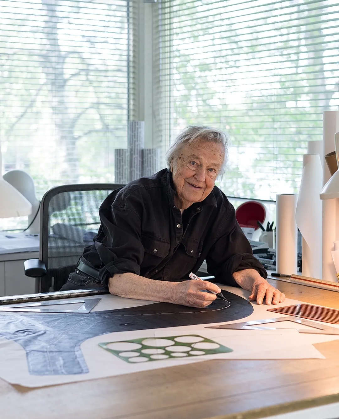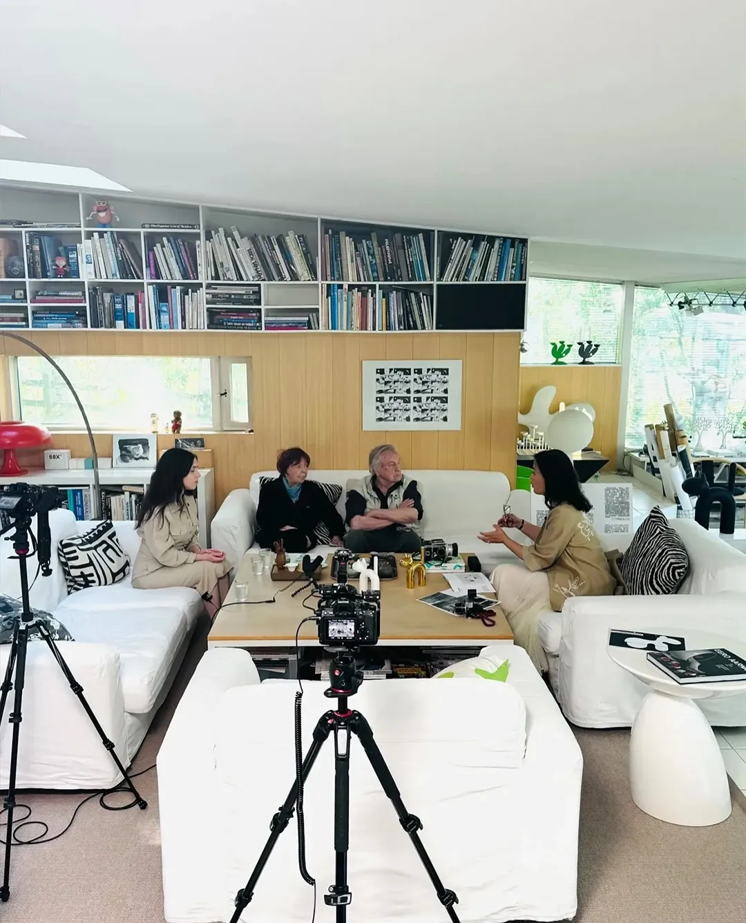 Photo: Luyang Jiang with Eero Aarnio, Pirkko Aarnio, and Milena Törmi (Eero’s granddaughter) at their home in Veikkola, Finland, preparing for the exhibition A Full Circle. Photo by Antti Laine. Courtesy of Eero Aarnio Originals