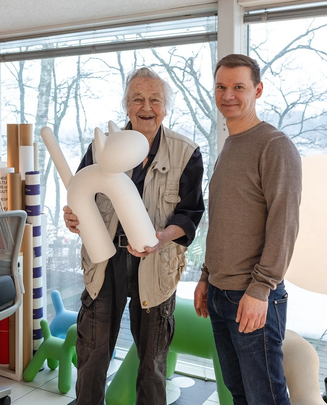Photo: Stefan Mahlberg, Founder of Eero Aarnio Originals, with Eero and his latest design, Kisu, 2024. Photo by Milena Törmi. Courtesy of Eero Aarnio Originals