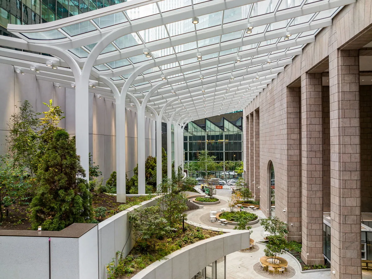 The revitalized Privately-Owned Public Space (POPS) at 550 Madison Avenue provides a collection of sociable gathering spaces linking 55th and 56th Streets. The new Garden is located under a steel and glass canopy and is filled with trees, shrubs, and grasses that will delight visitors across the seasons. Photo: Barrett Doherty.