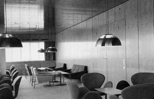 The AJ Lamp was used in several parts of the hotel, in copper and stainless steel. The AJ Royal, which at the time was simply called the AJ Pendant, could be found in a copper version above the tables in the snack bar behind the atrium, in the lounge on the 1st floor and in the Panorama Lounge on the 21st floor. The hotel opened in 1960 and with 22 floors it gave Copenhagen its first real high-rise building, clearly inspired by New York skyscrapers.