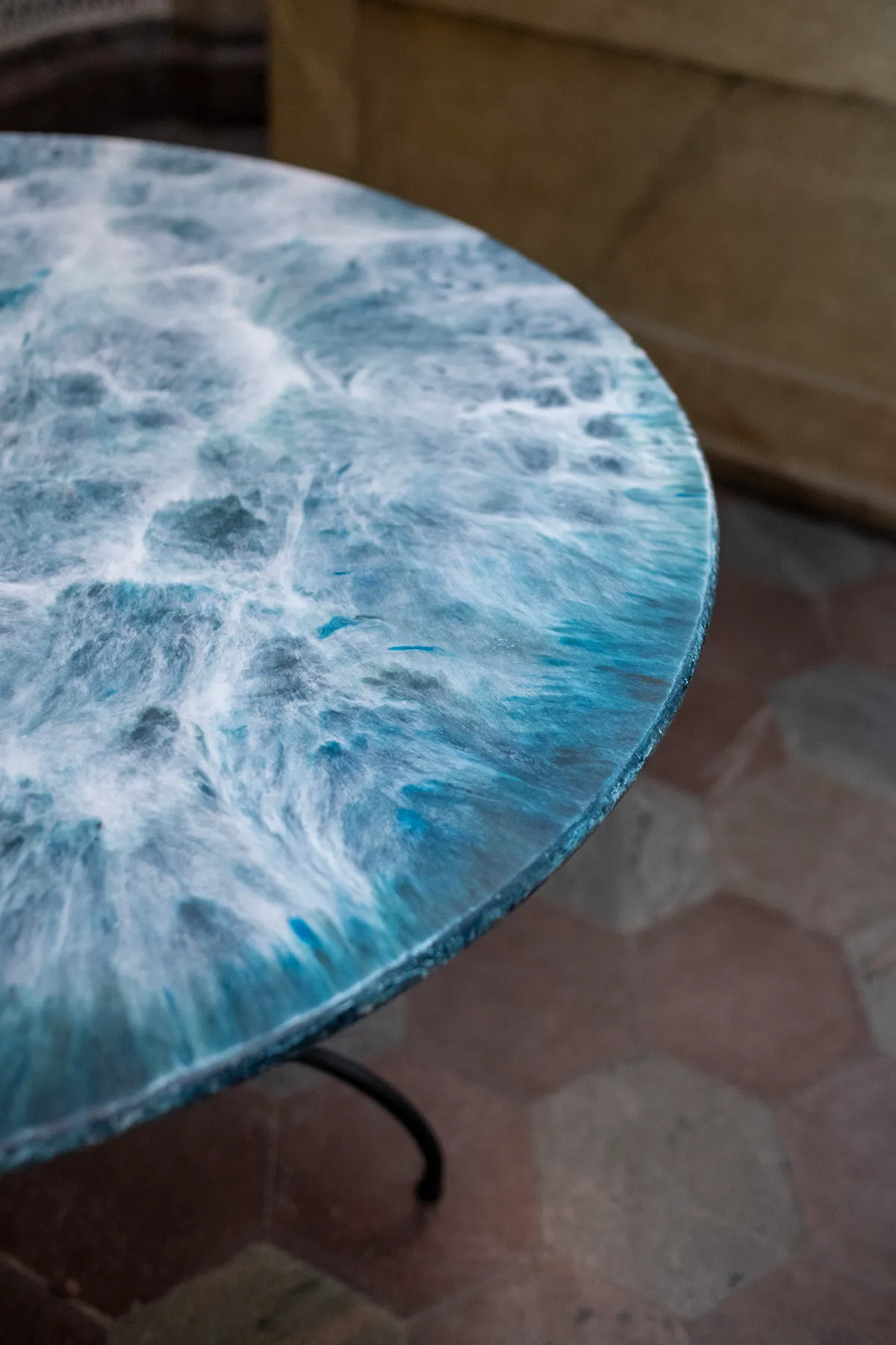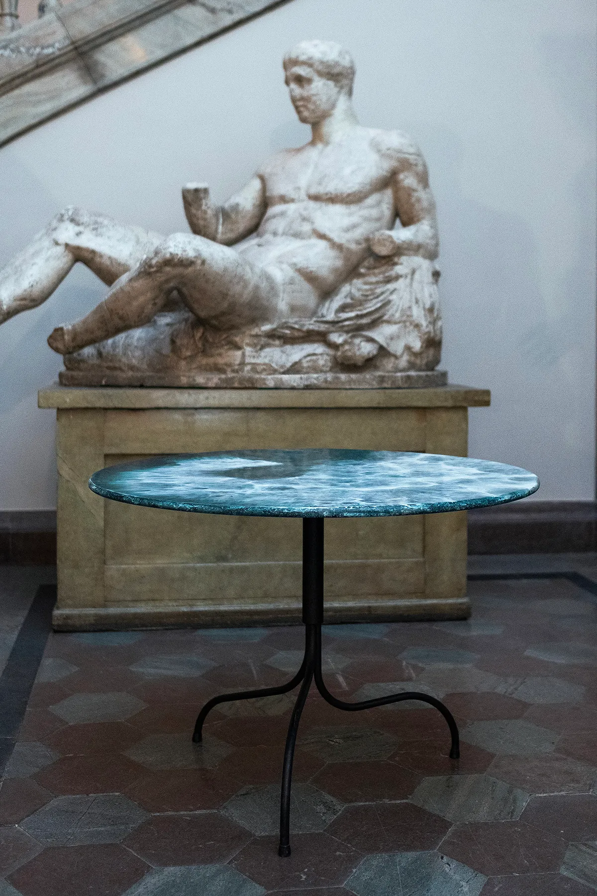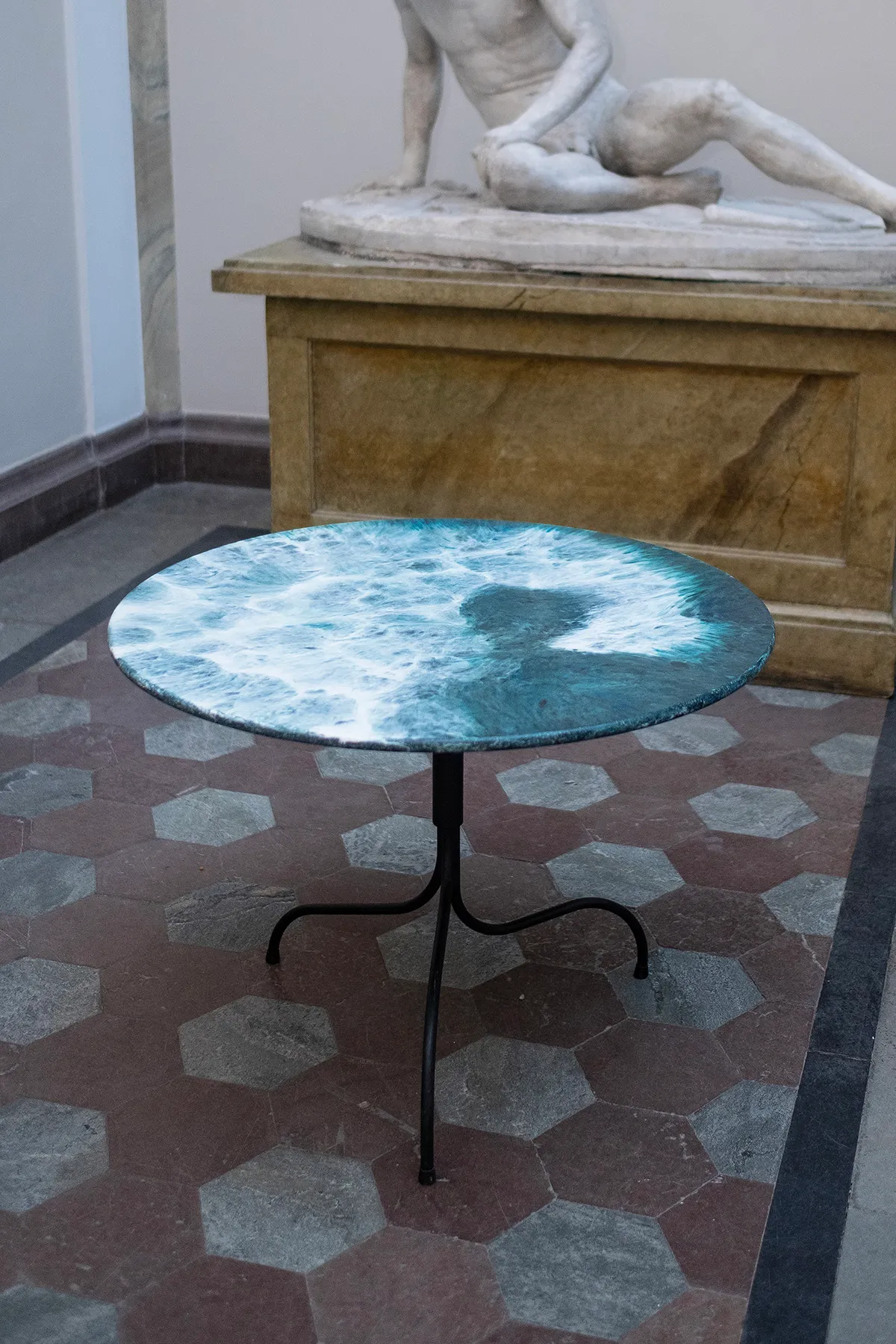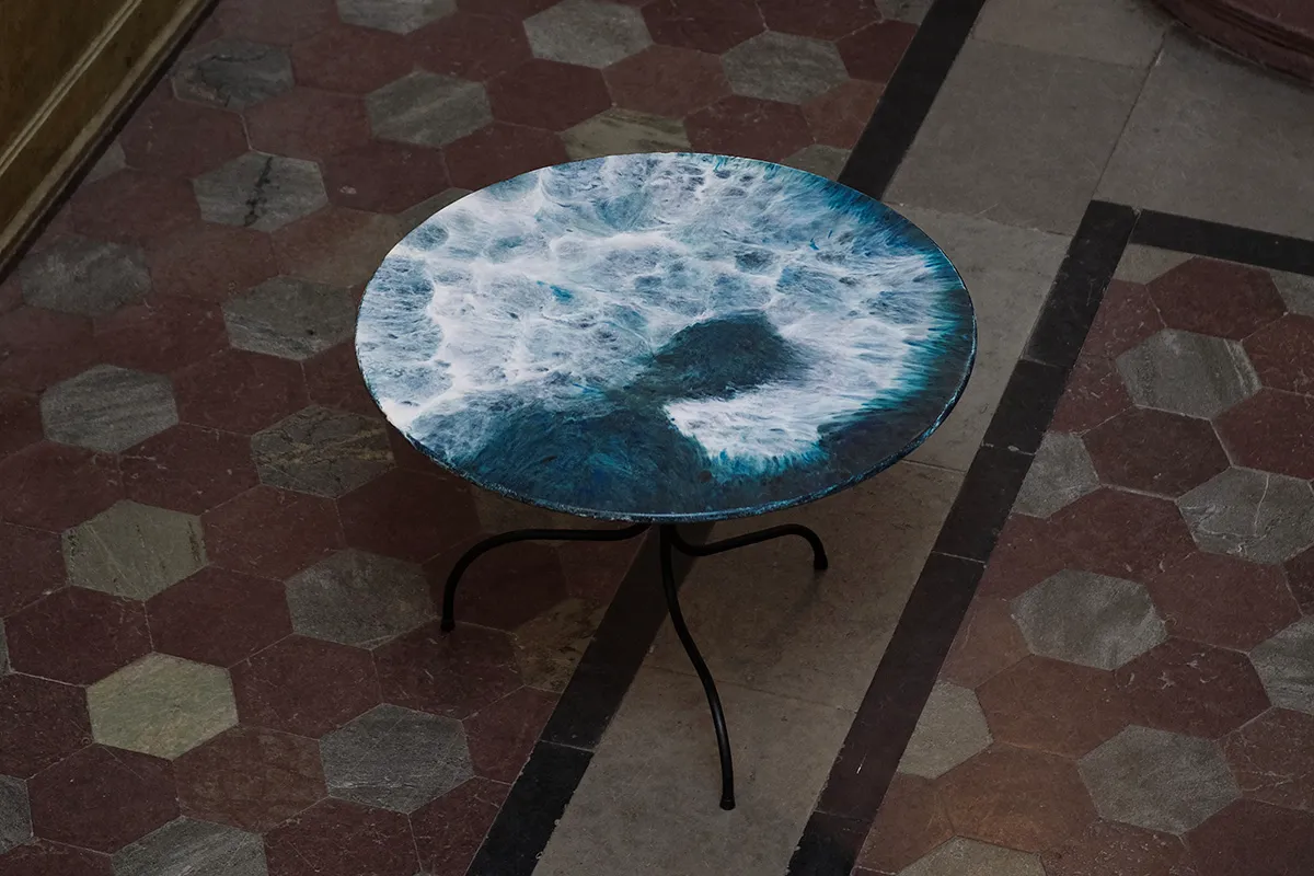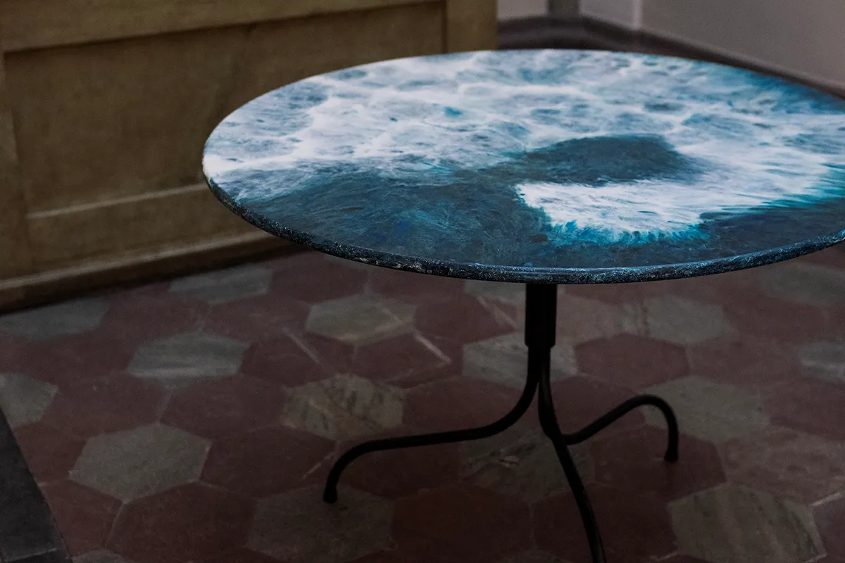 Interesting Times Gang’s Mahalo table-top made by pressing fishing nets from the West coast of Sweden, paired with Jonas Bohlin’s iconic LIV table inspired by his rowing journey from Stockholm to Paris in 1994, traveling along canals, rivers and the open sea. The form of the base embodies a locked floodgate where the water constantly seeps forward.