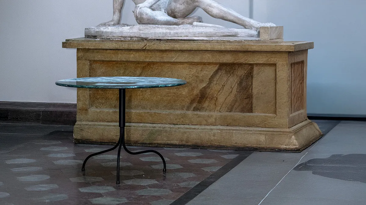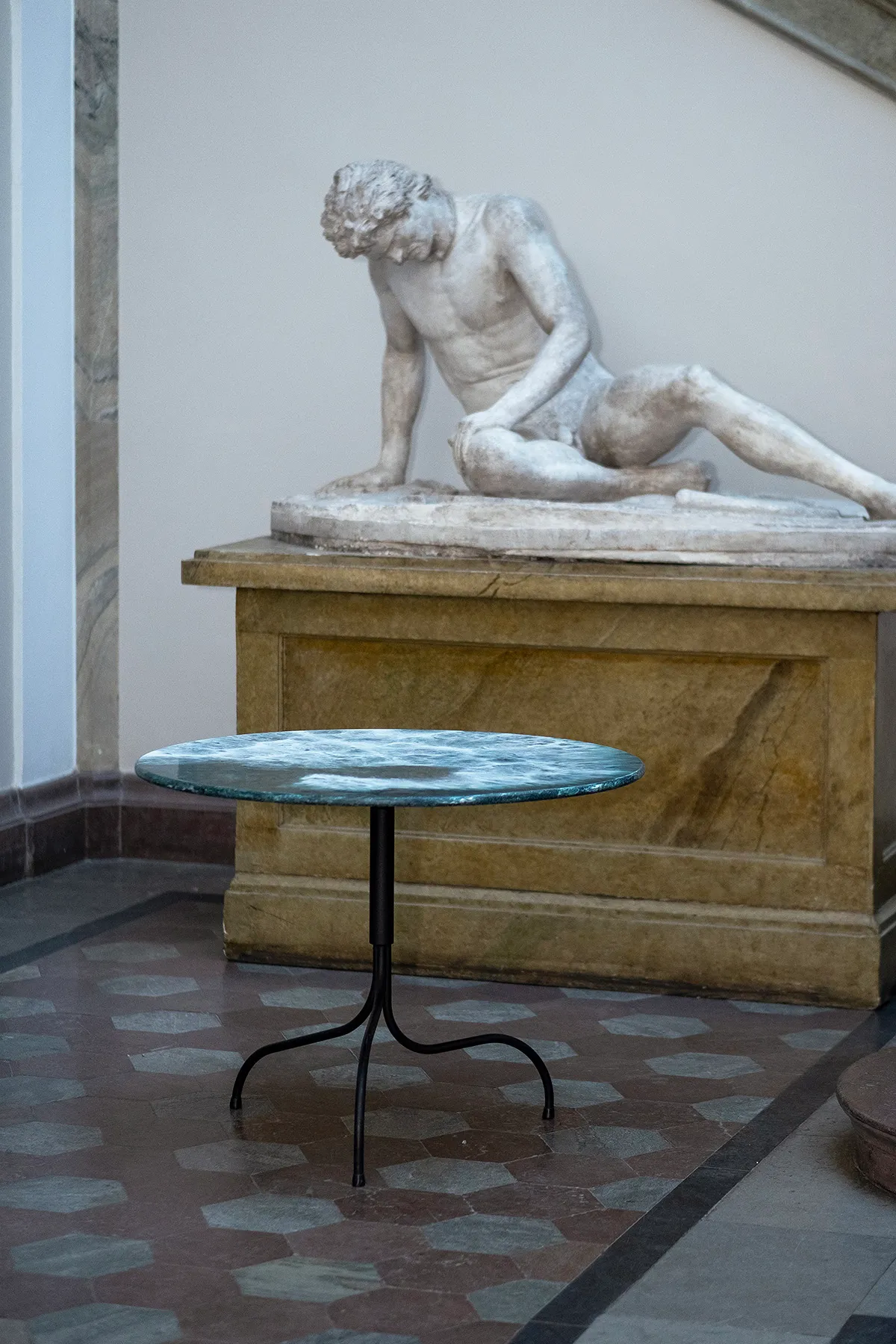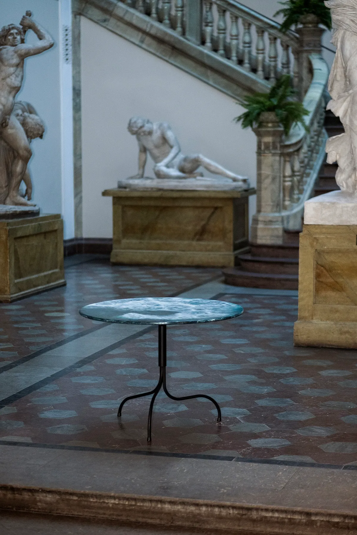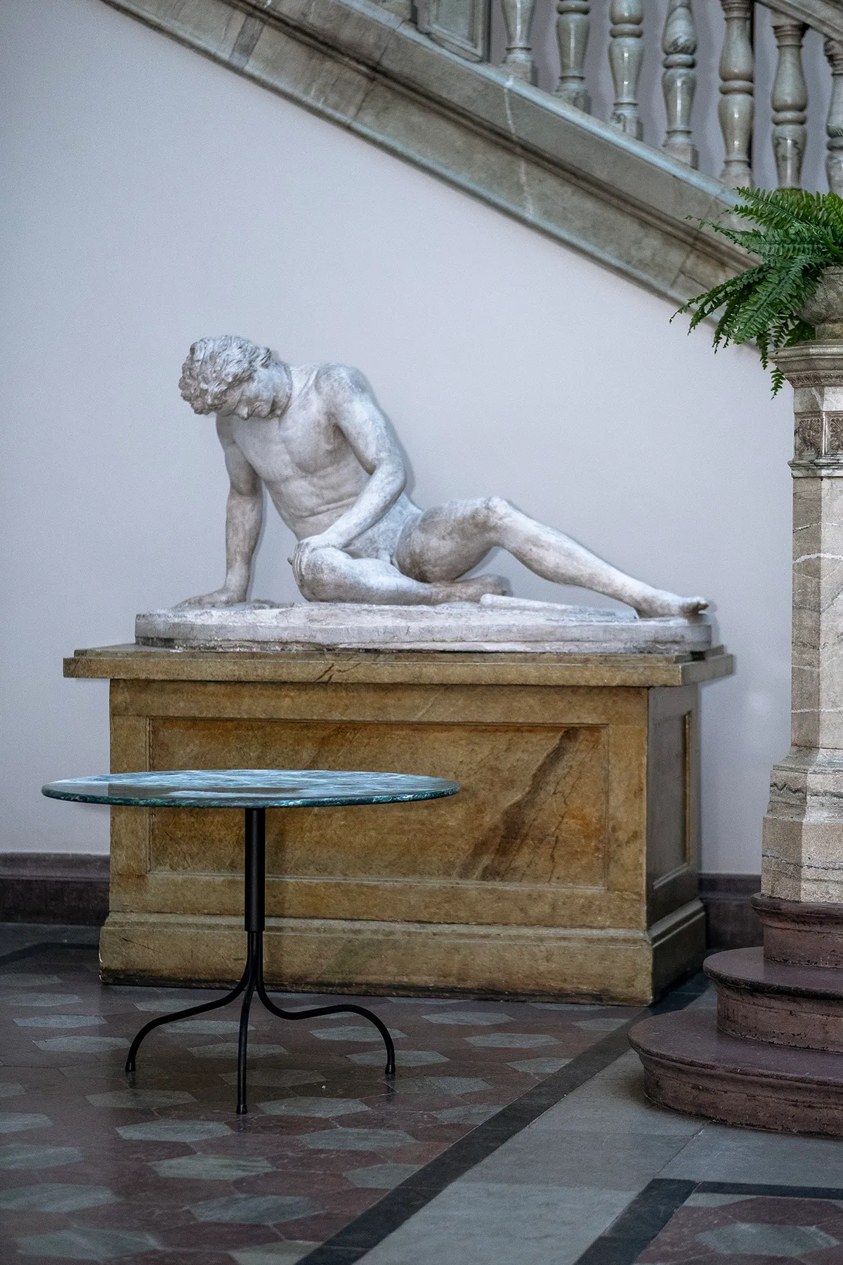 Interesting Times Gang’s Mahalo table-top made by pressing fishing nets from the West coast of Sweden, paired with Jonas Bohlin’s iconic LIV table inspired by his rowing journey from Stockholm to Paris in 1994, traveling along canals, rivers and the open sea. The form of the base embodies a locked floodgate where the water constantly seeps forward.