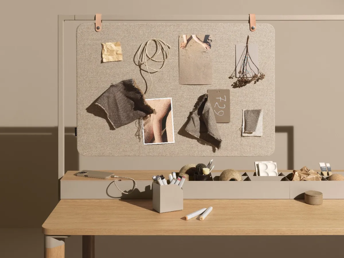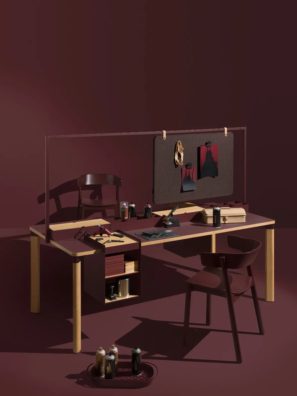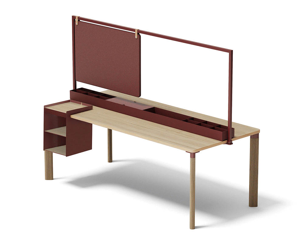 The table in the Embrace series is a multi-purpose system and creative take on the dinner or conference table, turned into a playful workspace with different colorful attachments and attributes. With its modular attributes the table is transformed into a modern workspace where each person can adjust the personal space with a hanging shelf, a sliding sound absorber, and a set of trays connected to a frame. The attributes are avaialbe in all the colors of the Summer collection: burgundy, latte, forest green, dusty blue and black.