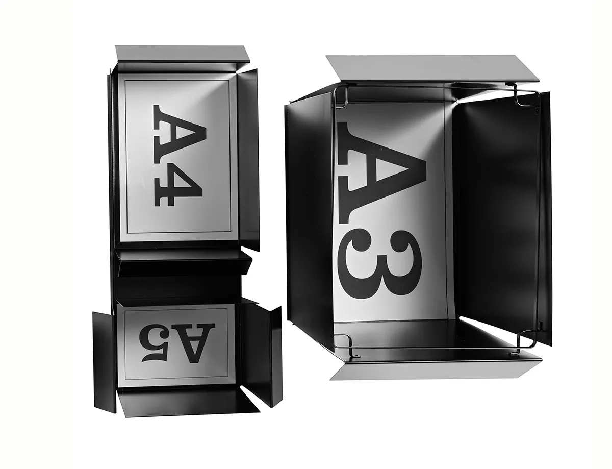 Among all formats, A4 is clearly the most important one for daily office use. The ISO paper sizes are based on the metric system. Using standard paper sizes saves money and makes life simpler in many applications. The Waste Paper basket varies in different sizes and all of them carries the dimensions from the A4-system. It is made out of laser cut and bent sheets of metal. They come in the same colors as the standard garbage bags carries.
