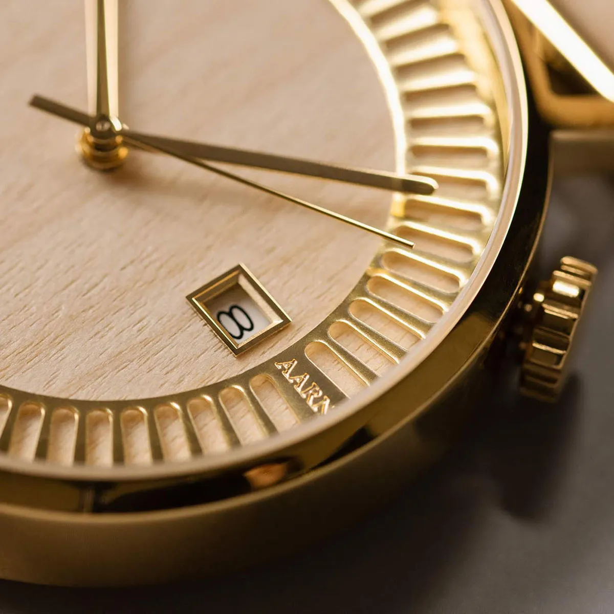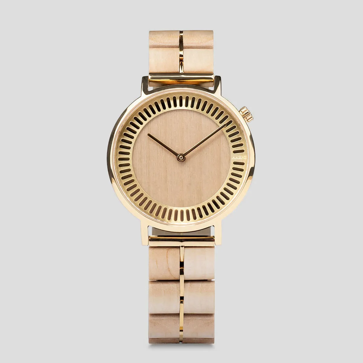 In the watch collection, the gold-toned case and the bezel structure with circular holes are combined with harmonious birch wood.