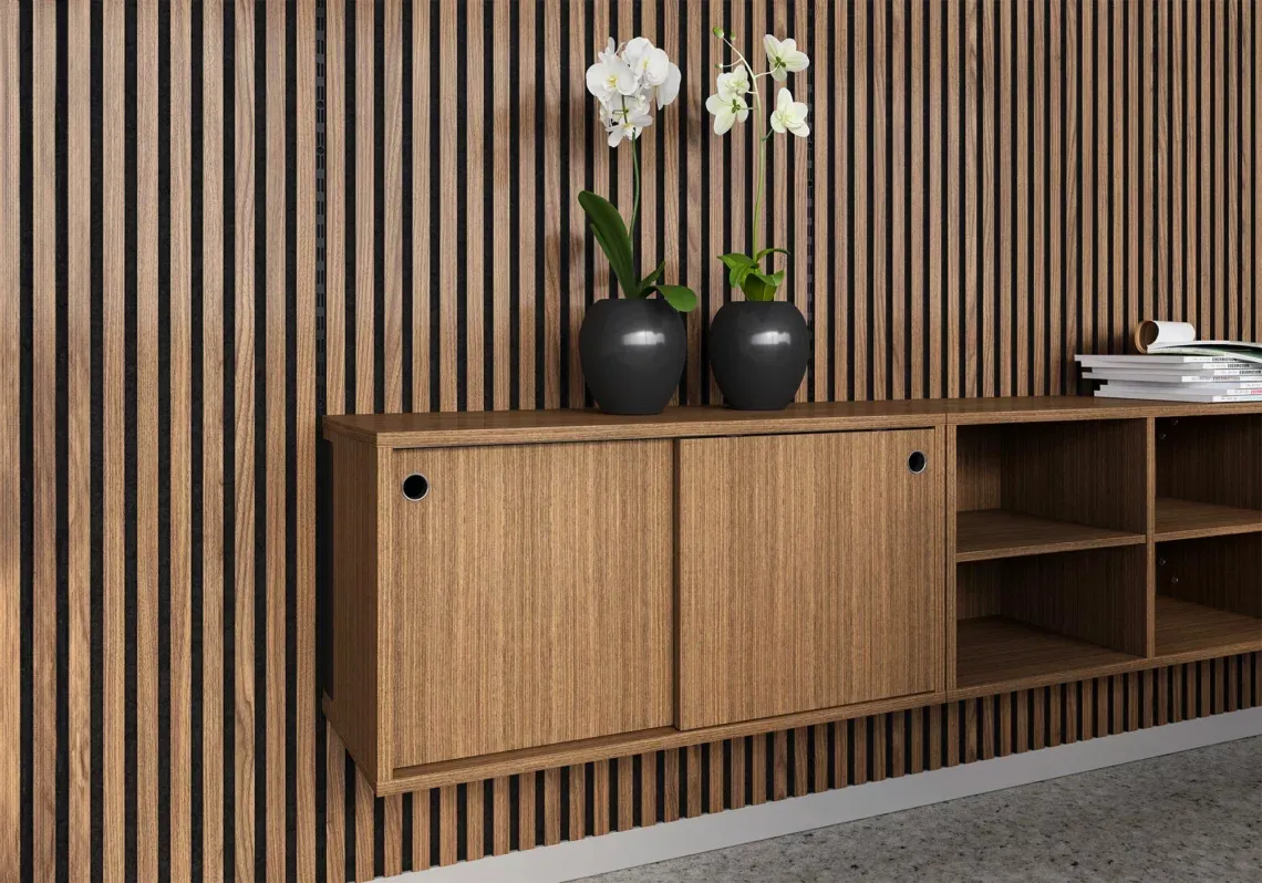 Pair with Ribbon Wood wall panels for a seamless and stylish look where the metal rails beautifully blend into the design.