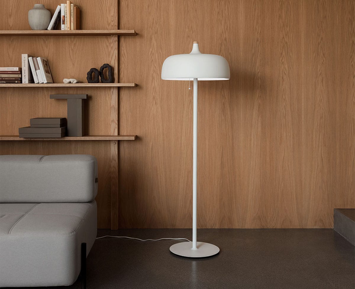 Inspired by autumnal Nordic forests, the longawaited Acorn Floor Lamp further develops the much-loved organic appeal of our popular pendant light. Originally designed by the awardwinning Atle Tveit in 2012, this modern, yet playful, floor lamp with its solid trunk-like shape and a tactile shade that resembles an empty acorn shell, also recreates the soft dappled light experienced beneath a canopy of trees.
