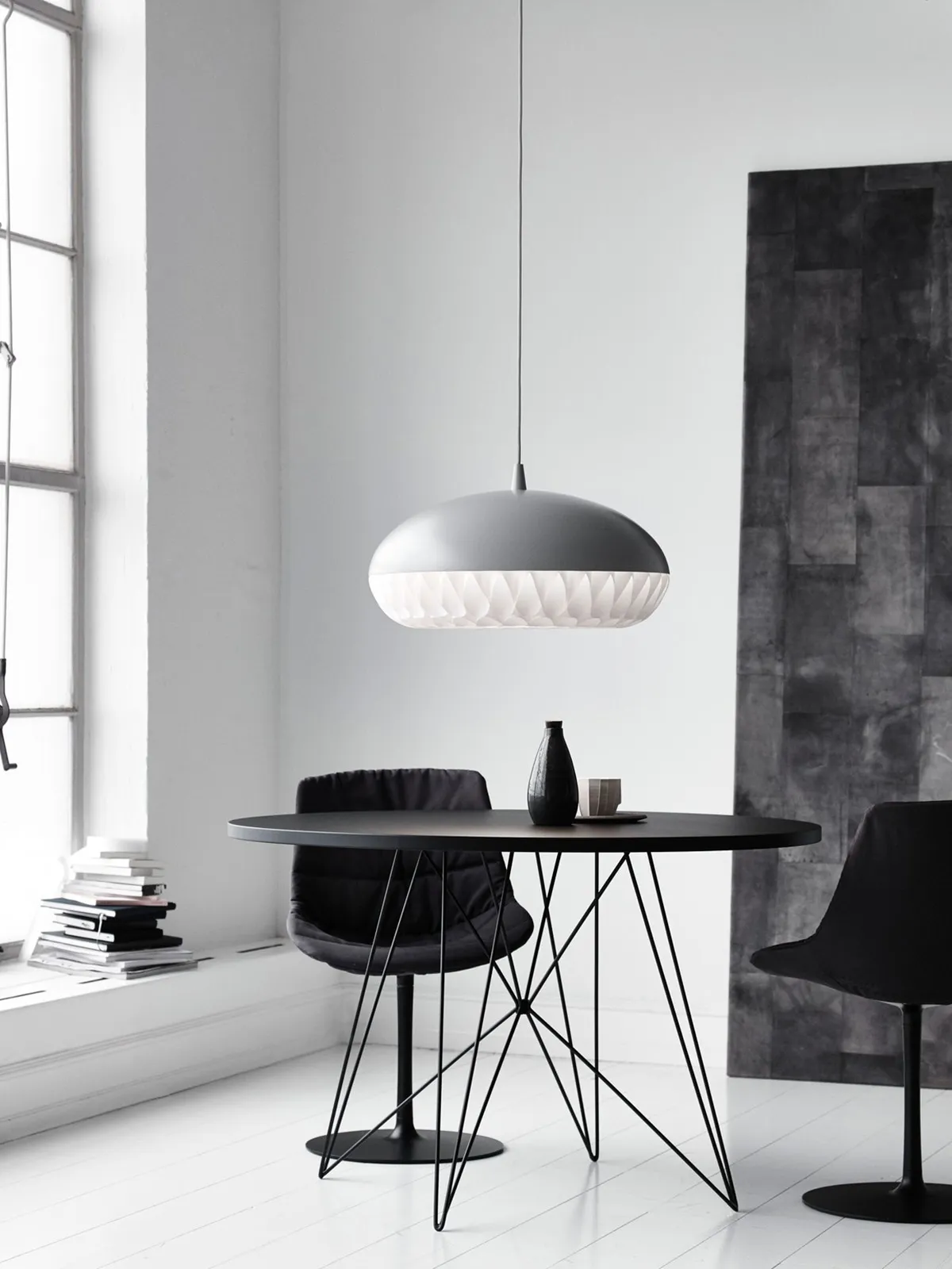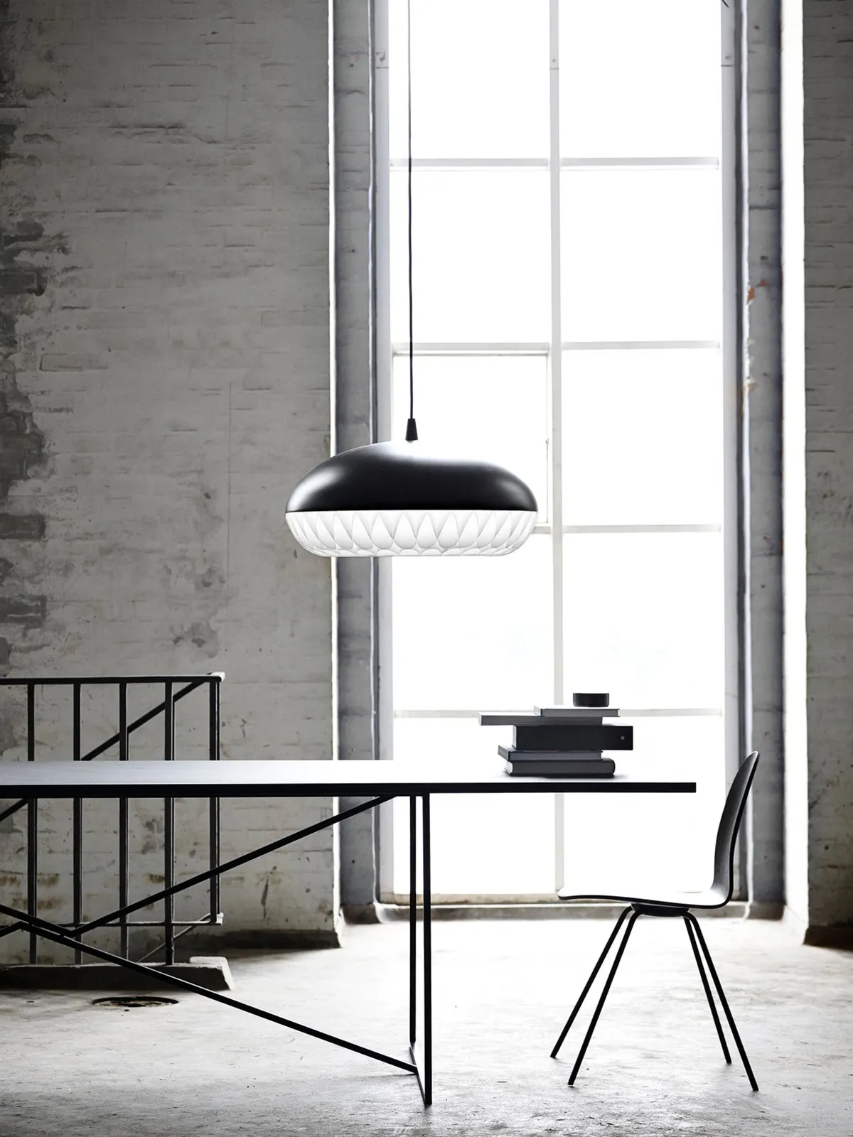 This is the first pendant in history to take full advantage of the luminous qualities of metal and polypropylene in a single design. The simple upper shade ensures plenty of light downwards, while the lower shade in polypropylene illuminates and diffuses the light. The gauzy lower shade consists of 8 long bands carefully woven together to create round openings, allowing the light to stream through unhindered. Available in two sizes, Ø 40 cm & Ø 50cm.