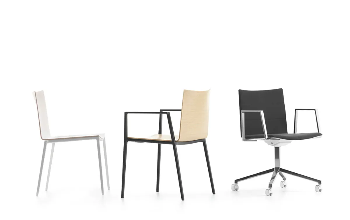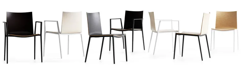 The Aeris chair is cast in aluminum and comes in different versions: with or without armrests, as a swivel chair or a stackable chair. The seat shell is made from molded wood veneer (ash or wenge) and is also available with a fully or partially upholstered seat and back.
