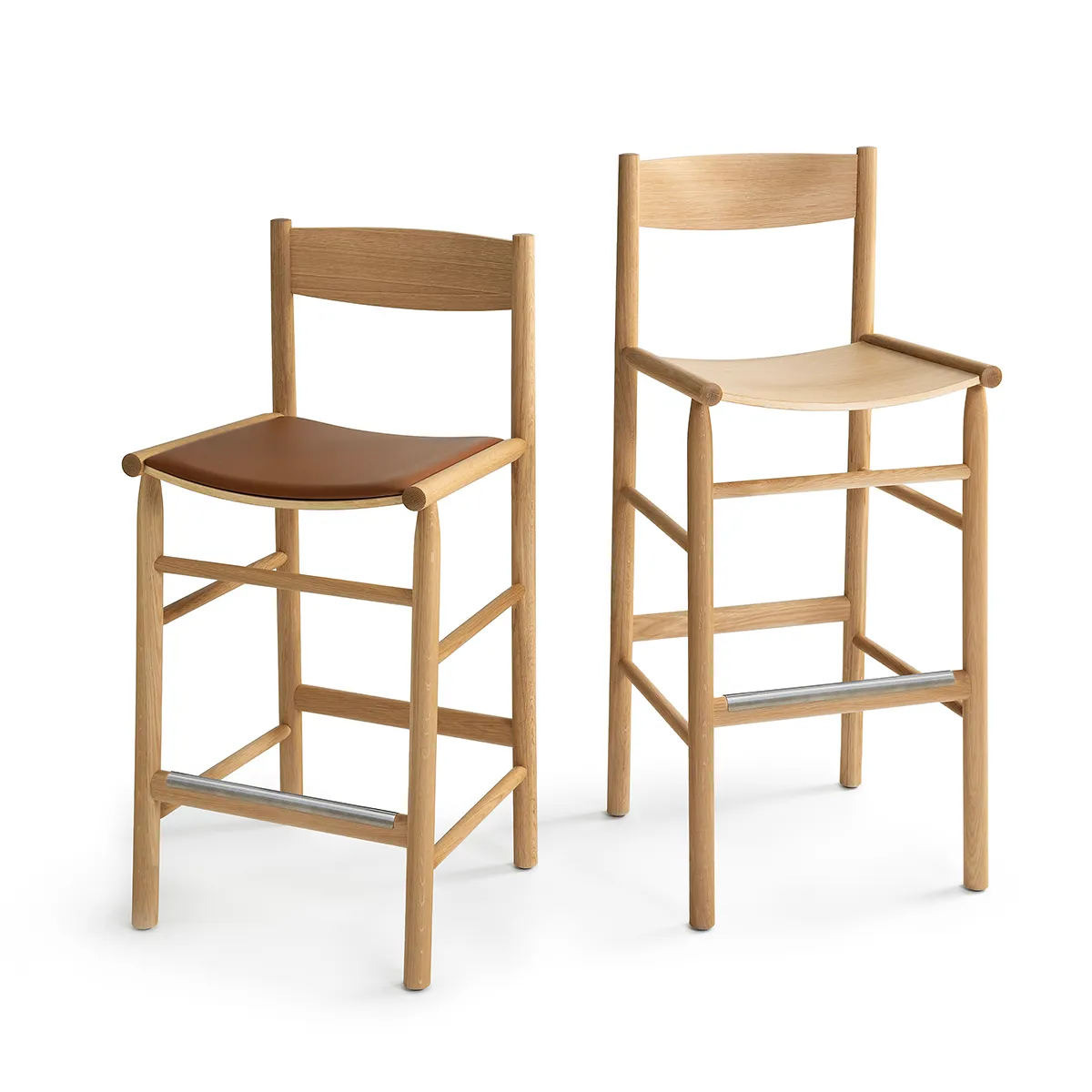 “The intention of the Akademia Bar Chair was to make bar-height seating that is as comfortable as a dining chair. The relatively high backrest and ample seat width ensures that even a full meal can be enjoyed at the bar. As with the Akademia chair, minimal, vertical lines are complemented by the thin curved plywood of the seat and backrest. Available with leather or textile upholstery for additional comfort.”