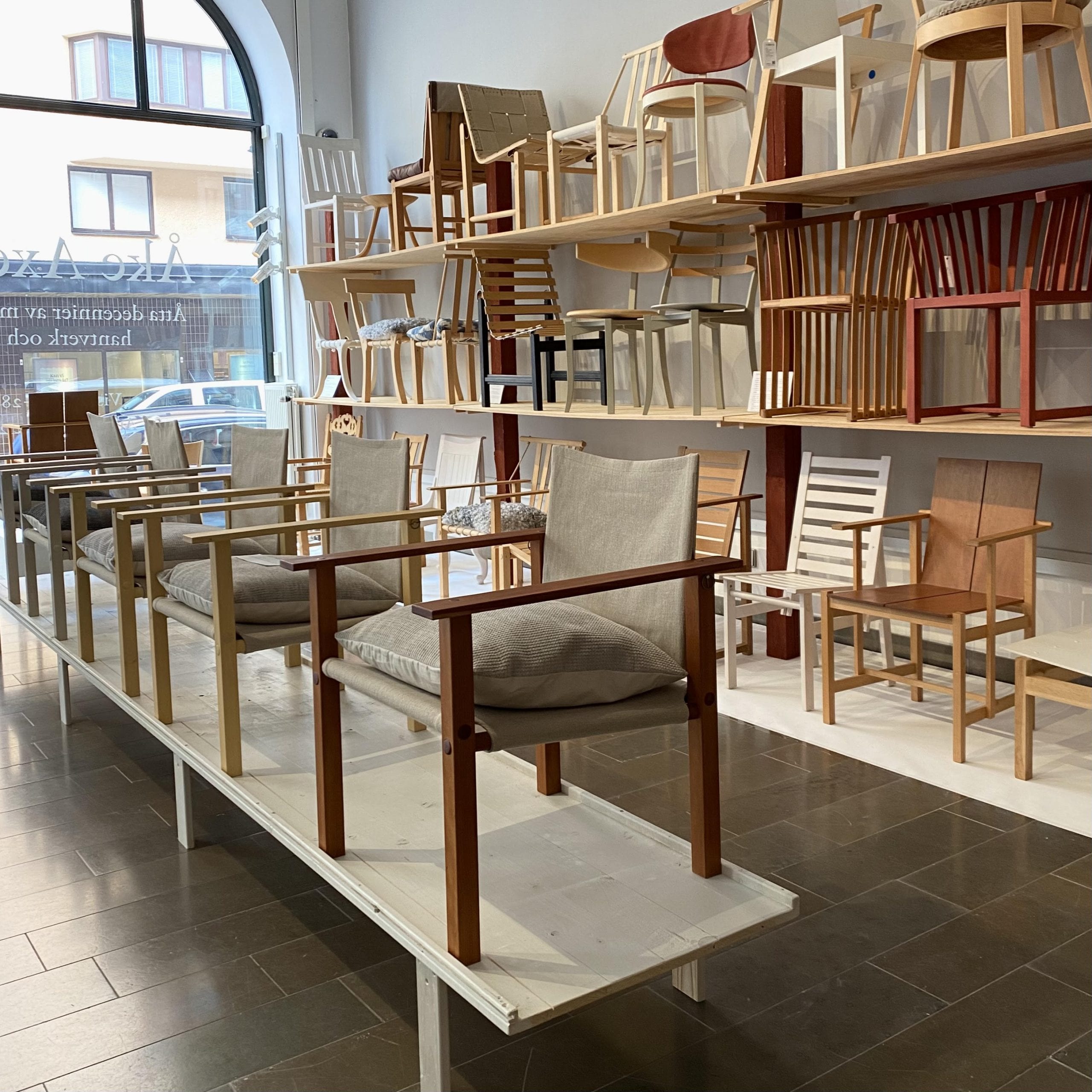 This exhibition contains Åke’s own furniture, which for more than a year has been shown at an acclaimed exhibition in Copenhagen, as well as furniture for sale: series chairs, odds and ends, drafts and prototypes. A great opportunity to purchase something unique. A solid speaker’s chair? A modernist experiment? Unique easy chairs made for Svenskt Tenn? The famous Riksdagsstolen from the Swedish Parliament? A classic such as the Vaxholmaren? Particularly exciting are the newly made workshop pieces: gilded benches, made this very summer, Ararat benches and Nomad stools with cushions of Swedish wool woven in collaboration with the Friends of Handicraft. Such prodigious craftsmanship.