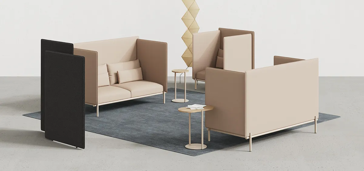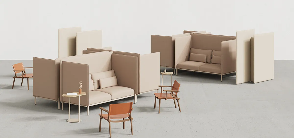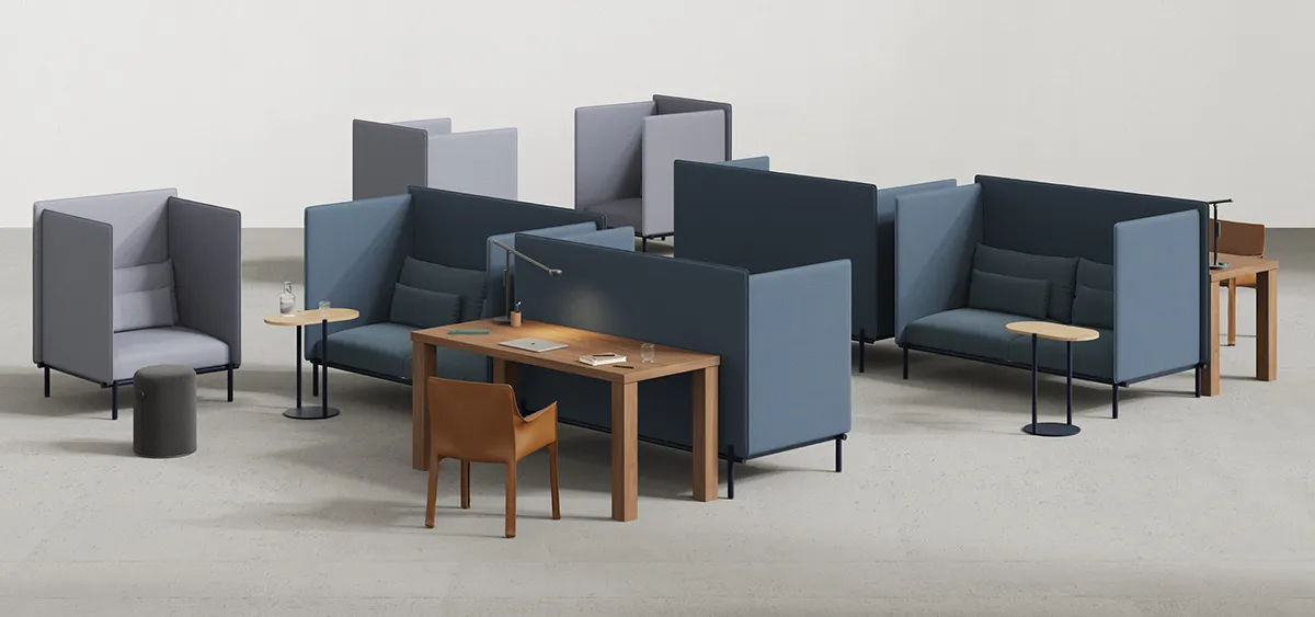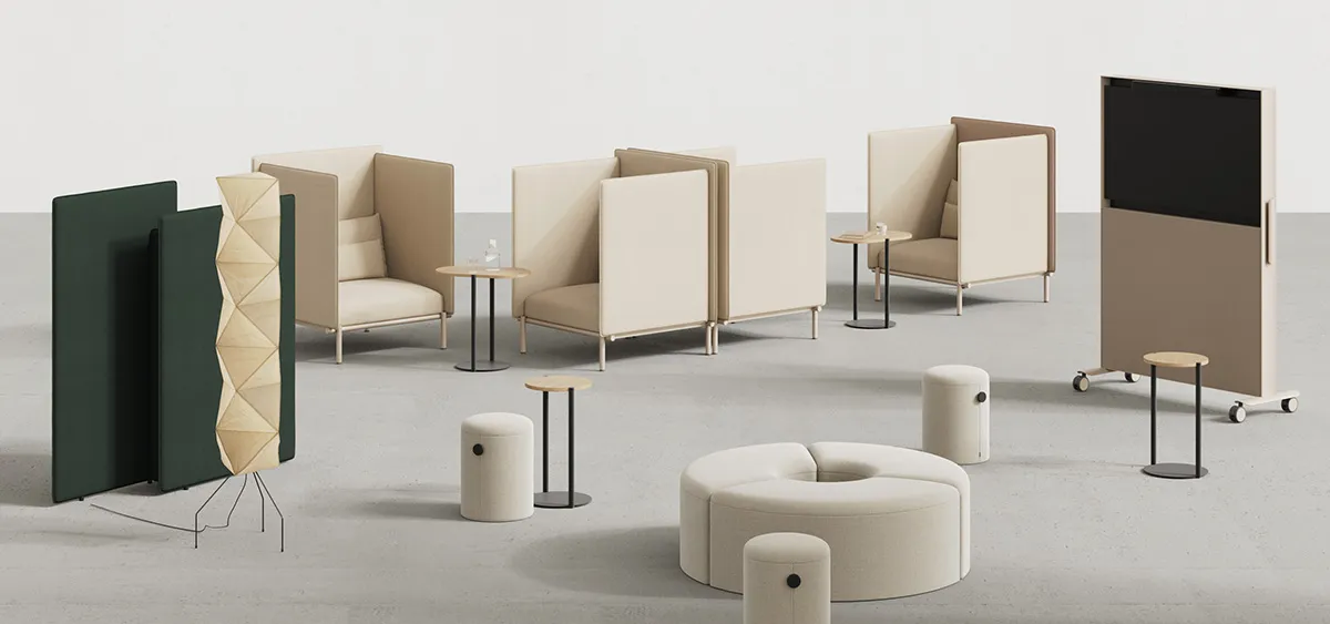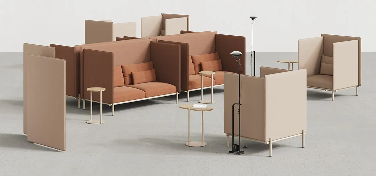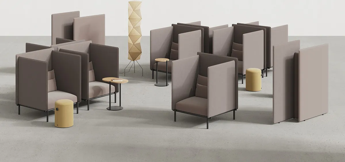 The concept consists of generously deep and comfortable acoustic seats in one-seater and two-seater versions; an innovative floor screen; and two neat tables, one round and the other oval.
