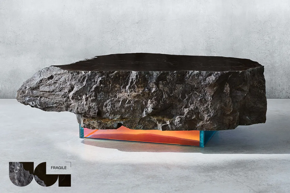 The stone furniture is symbolic in several ways, and the contrasts of the materials are in focus. The time we live in now is the most sensitive period since the days of the Cold War. In the table, the 400-kilogram boulder rests on top of the fragile glass. It is a metaphor for our strange reality, where the fate of the entire world depends on thin, fragile agreements between countries. The glass’s reflections and change of color depending on the viewing angle reinforce this feeling of unreality and that depending on how you look at it, there can be hope and despair in the same reality.