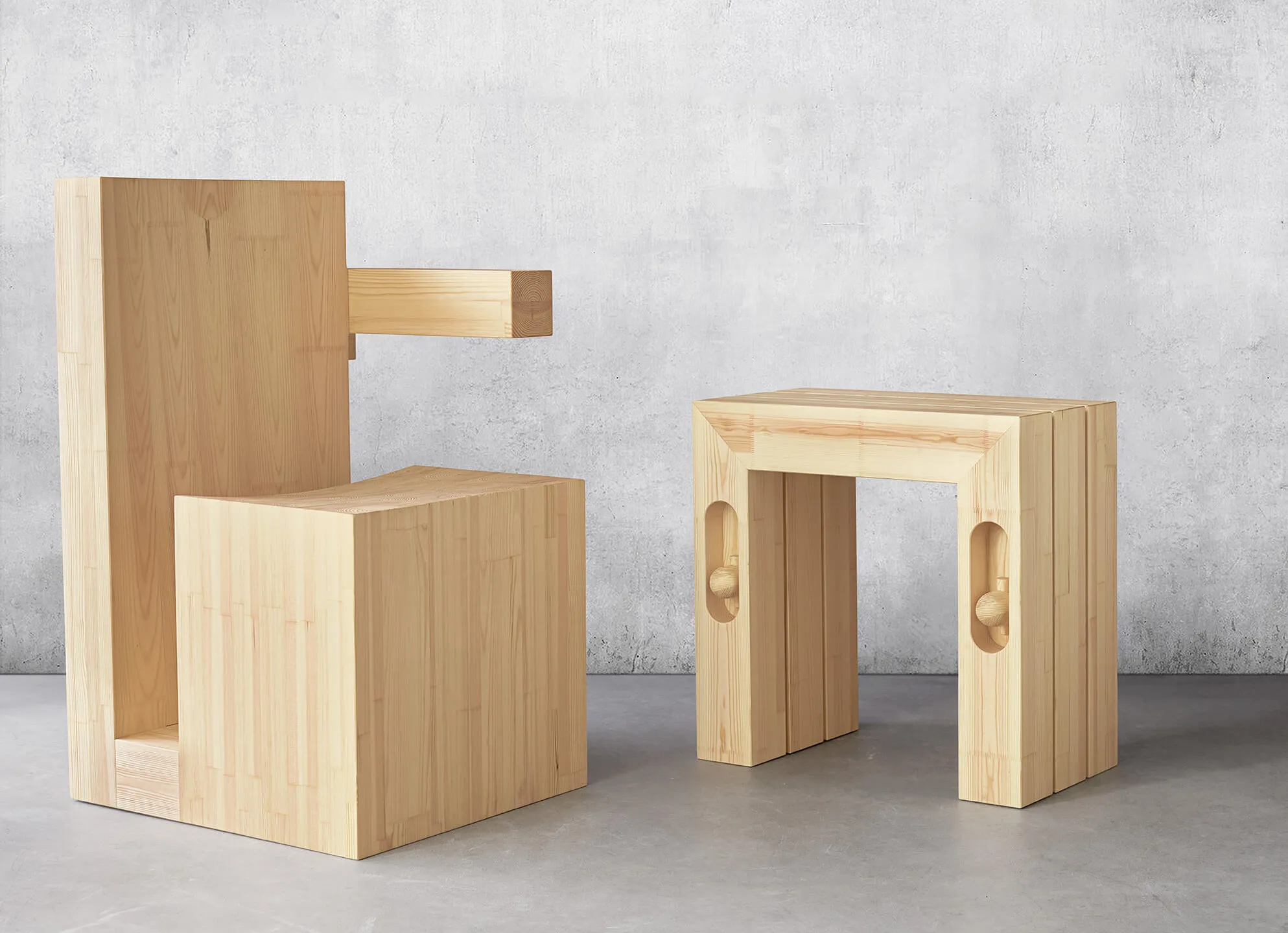 From the waste wood that arises in connection with the manufacture of the stairs, Alexander has designed a limited furniture collection consisting of a table, an armchair and a bench – manufactured using the same technology as the stairs. These are was shown in Alexander’s newly opened Unikat Gallery during Stockholm Design Week 2023.