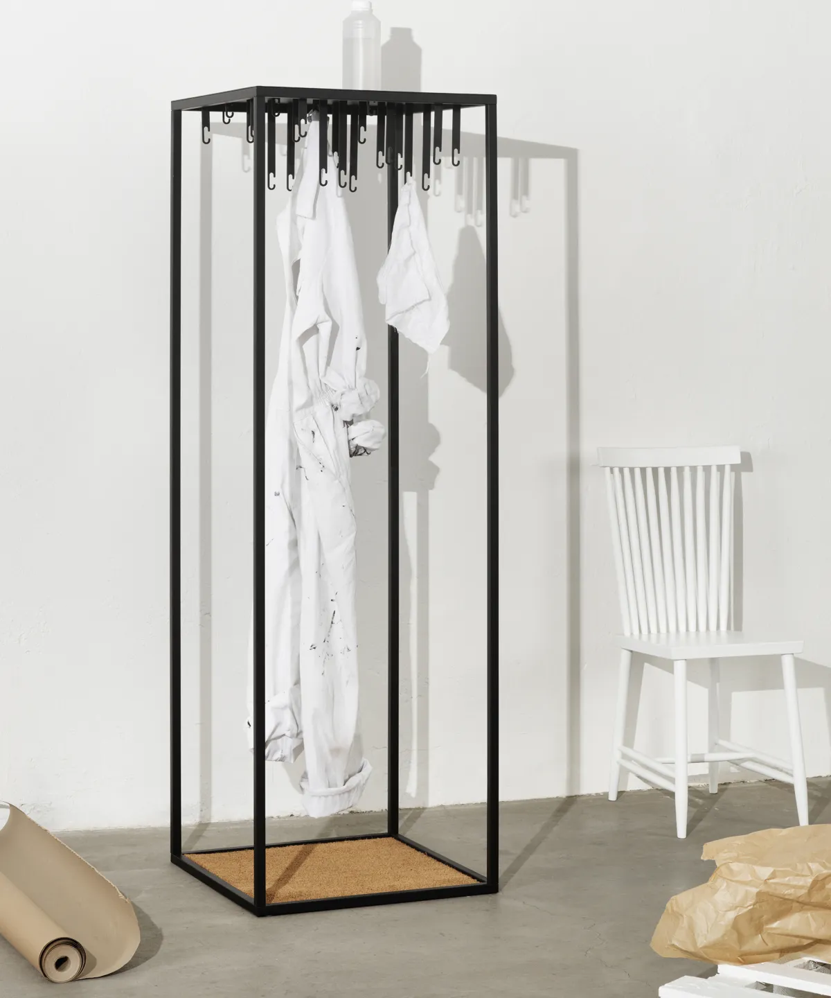 Alexander Lervik’s Floor Hanger is a graphically precise framing device for featuring rather than hiding clothes