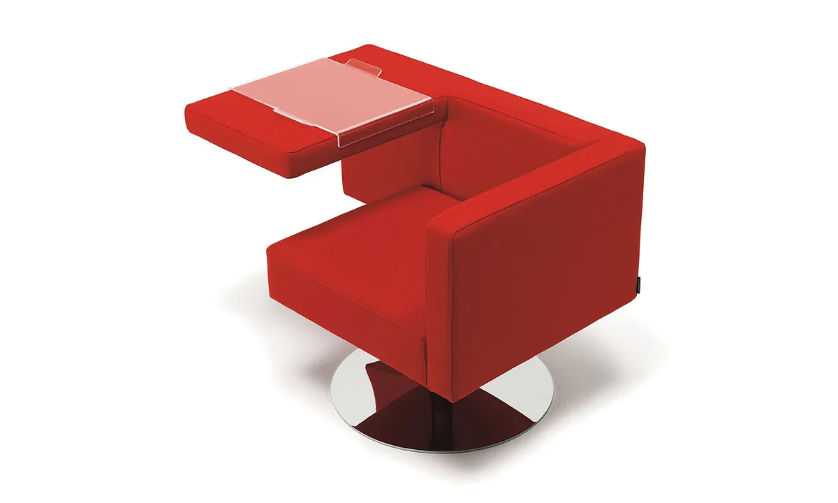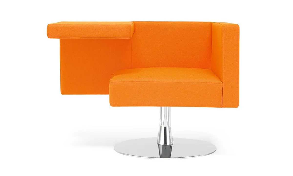 Alfredo Häberli’s new SOLITAIRE is an easy chair where one armrest is like a desktop, for writing, reading, eating or just sitting on. The freestanding chair revolves and, with its ingenious and functionally designed armrest, performs more functions than being just a seat.