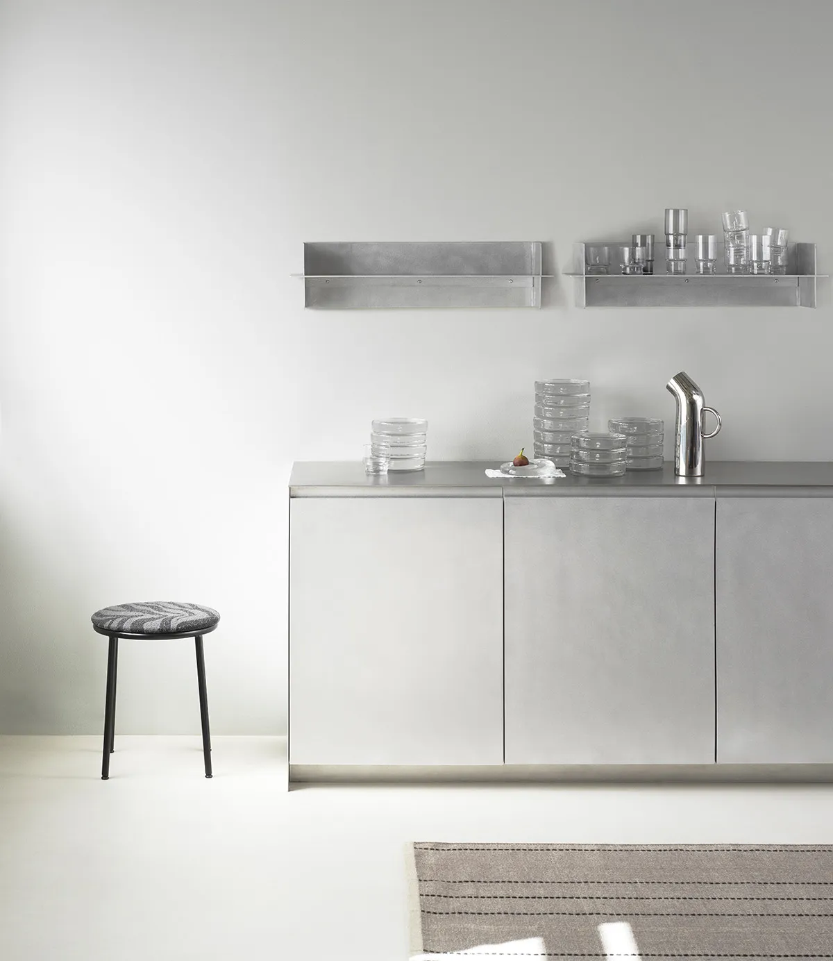 By bending the material with precision, the Alu Shelf achieves both its function and a striking aesthetic. The result is a closed, architectural form that subtly frames its contents, emphasizing objects rather than the shelf itself. Available in three sizes—80 cm, 60 cm, and 25 cm—it seamlessly adapts to different spaces and needs, from a kitchen or living room shelf to a compact bedside table.