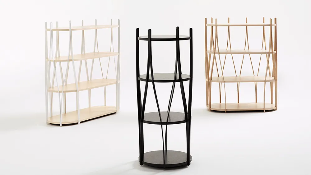 Alva shelving comprises slender strips of wood held securely in place by the shelves they suspend to create a construction that is as strong and stable as it is stunning to behold. The design takes the material to its limits by utilising the torsional strength of wood to create a structure of high rigidity. Alva is light and airy in appearance, but it is extremely sturdy too. Alva makes an ideal room divider, but it can also be used as shelving beside a sofa or armchair, while the round shelf provides a smart solution for corner storage.