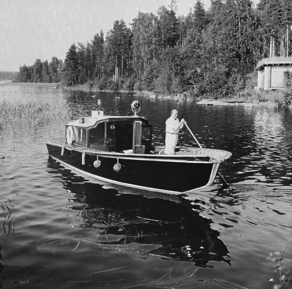 Alvar Aalto and his boat at the Muuratsalo shore in 1950´s. Photo Pellervo Oksala, Alvar Aalto Foundation.