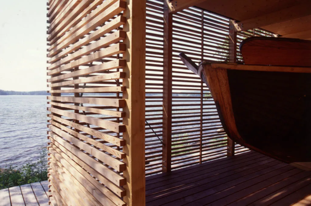 The vessel was in frequent use by Alvar and Elissa Aalto when they spent their summers on the island in Lake Päijänne in 1955–1976. The architect couple took Nemo propheta in patria (no one is a prophet in his own land) to do their shopping and to transport summer guests, with Elissa Aalto often seen at the wheel of the boat. In the 1980–90s, the boat was kept in the harbour on Juurikkasaari Island in Säynätsalo, until it was decided to site it on the shore by the Muuratsalo Experimental House, which was opening to the public as a museum. In 1996, an international competition open to architecture students was held for the design of a boathouse, and a boat shelter by the Danes Anne-Mette Krolmark and Claudia Schulz fitting the proposal was completed in 1999. The design idea was that a shed built of widely spaced larch slats would turn grey beautifully with time and protect the boat, while allowing it to be viewed from outside the boathouse.