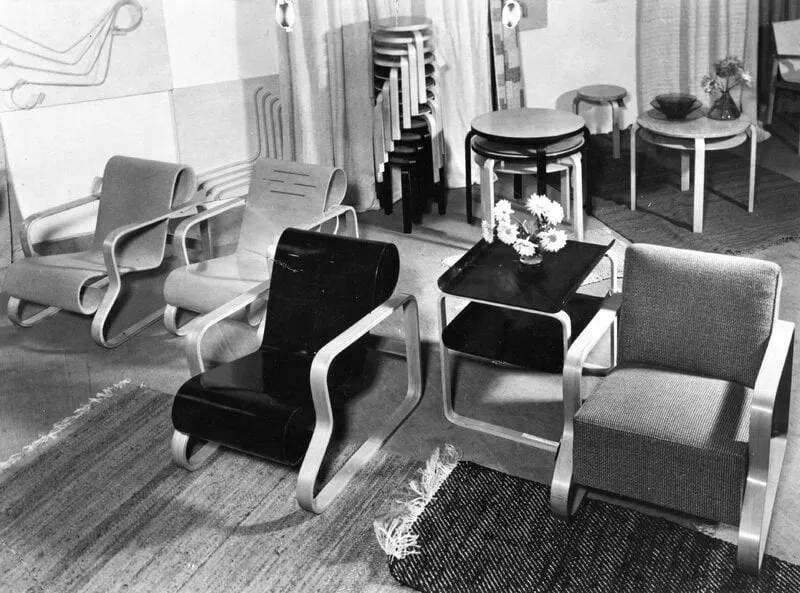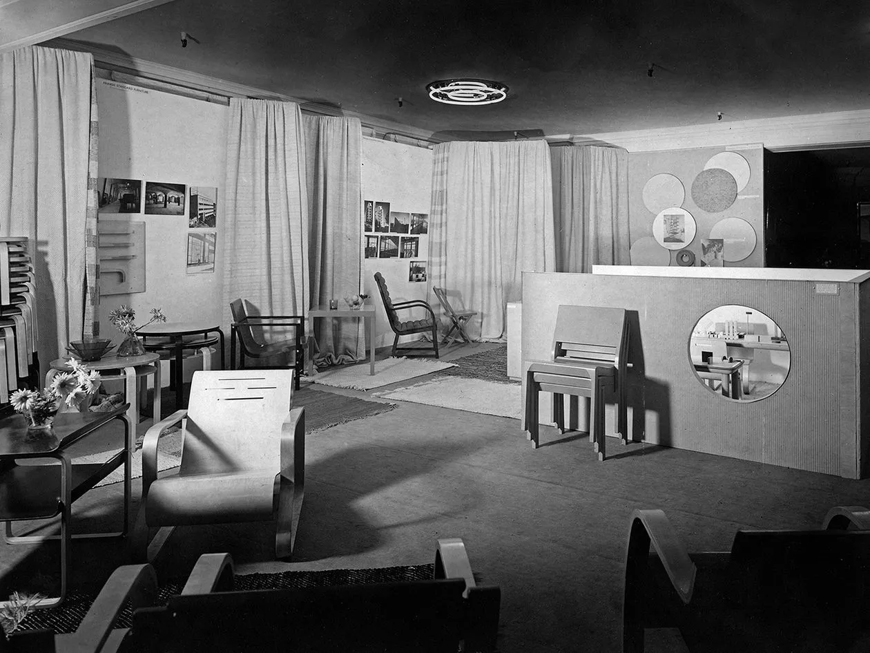 The Wood Only exhibition was a landmark moment for Finnish design, marking Alvar Aalto’s first time introducing his furniture outside of Finland. Image: Fox Photos, Alvar Aalto Foundation.