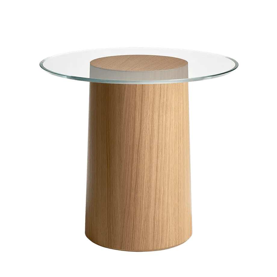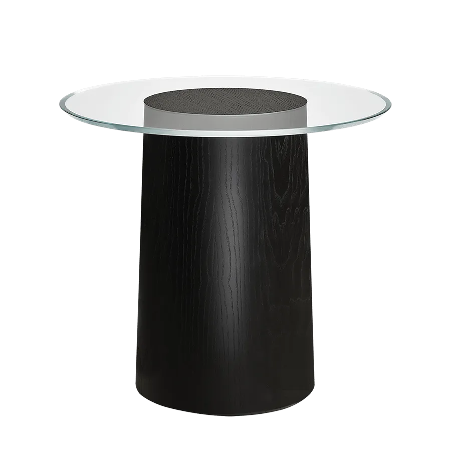 An elegant side table by Danish architect Mette Schelde integrates wood and glass seamlessly. Wood and glass merge smoothly within this unique table design. Inspired by landscapes of wood stumps, Stub (which means ‘stump’ in Danish) has a clear glass circle that floats around the base with no visible screws or mountings.