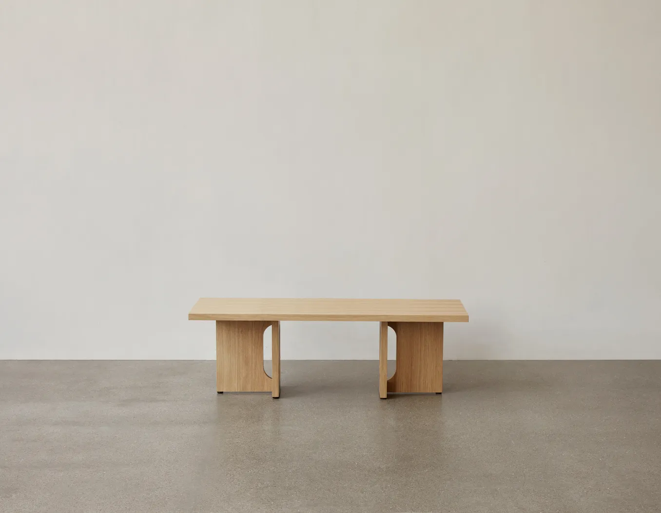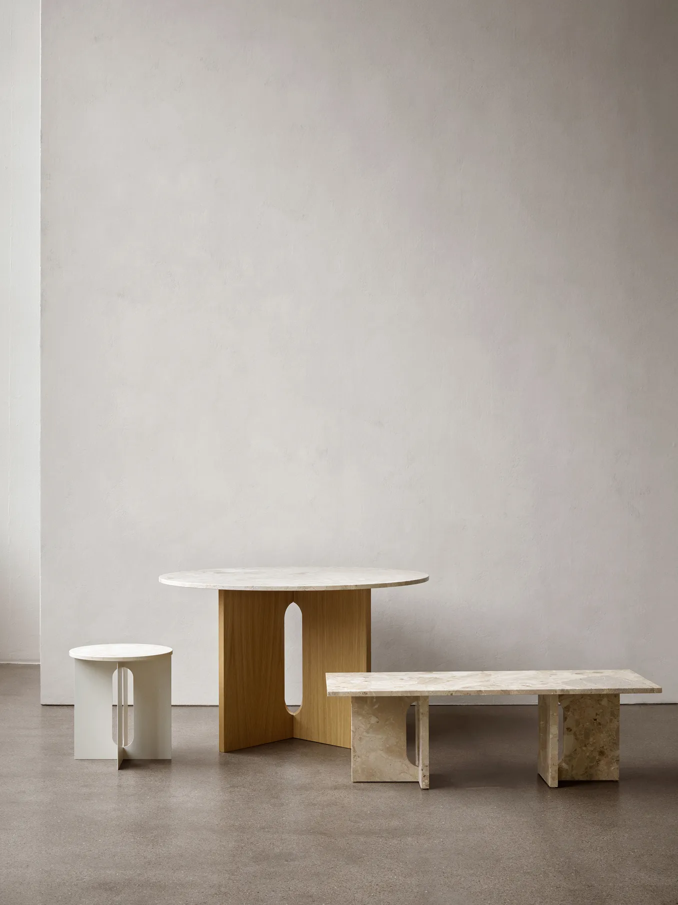 The Androgyne Lounge Table celebrates MENU’s approach to natural materials and the age-old tradition of furniture craft smanship – and is now updated with a natural or dark stained oak or walnut tabletop and base, adding warmth to the modernist design. The option to pair a wooden base with a kunis breccia stone tabletop creates an intriguing pairing and makes it a thoroughly versatile design that doubles as bench for piles of books or statement decorations.