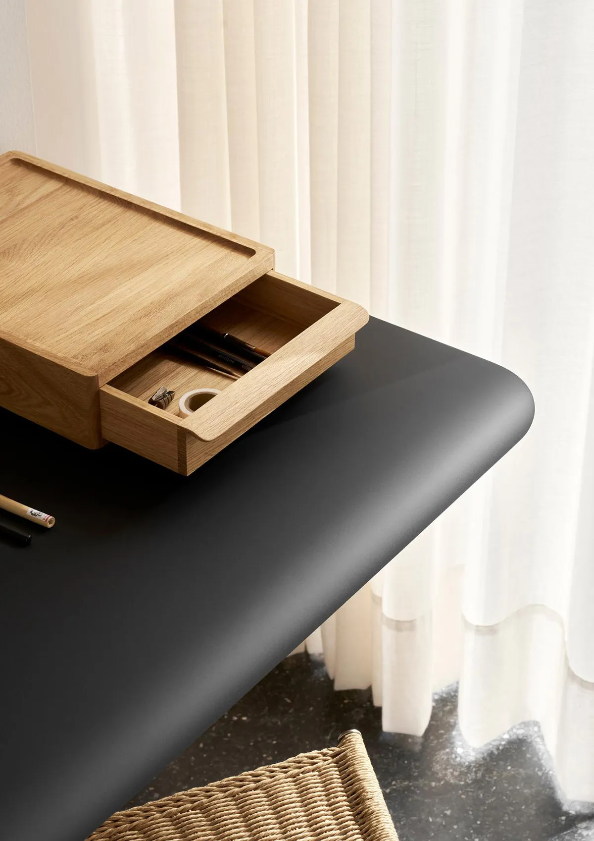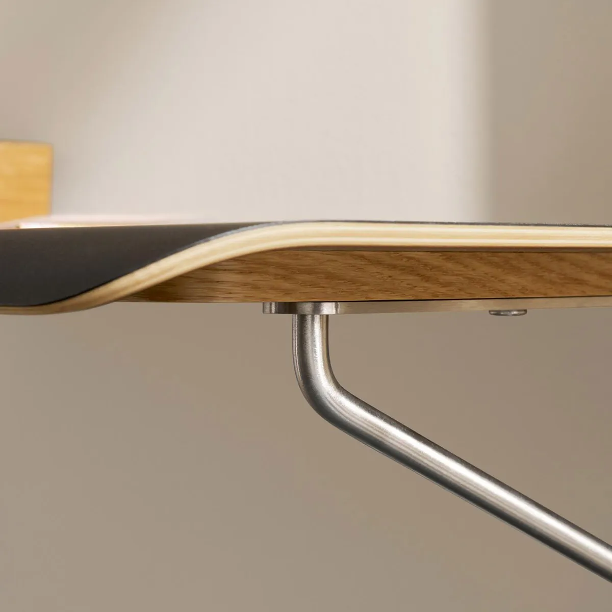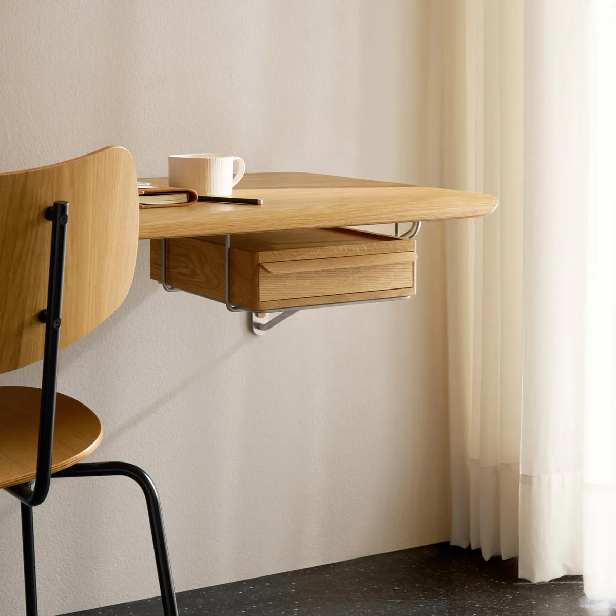 The desk consists of a slim tabletop, made from oak or laminate, and stainless-steel wall mounts. Its design embraces a minimalist aesthetic, showcasing beautiful yet functional details. The tabletop is finished with a rounded edge that softens the design whilst also serving as a comfortable armrest. An optional wall desk drawer made from solid oak mirrors the organic, tactile design idiom of the desk and can either be fitted underneath the tabletop or positioned on top, doubling as a laptop stand. Equipped with a practical opening for wires, the spacious drawer allows chargers to be discreetly stored out of sight. Magnetic, solid oak cover caps hide the wall mount screws to complete the desk’s simple look.