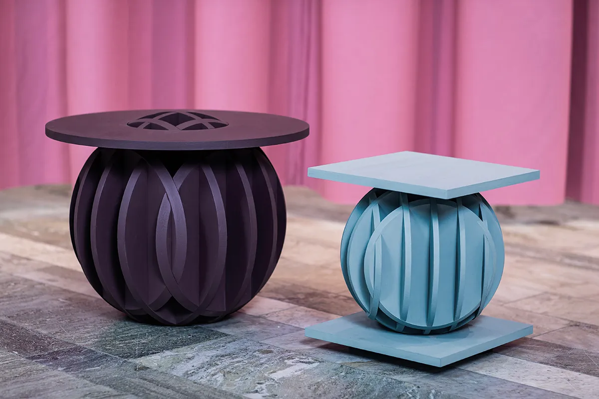The sculptural furniture features horizontal planes that delicately balance on latticed spheres, offering a captivating interplay between weight and lightness, solidity and layering of planar surfaces.