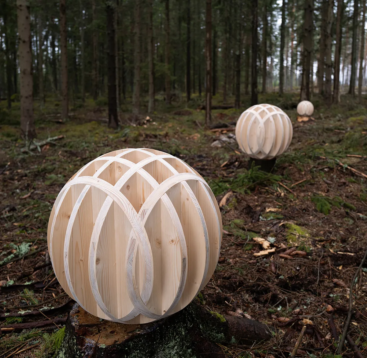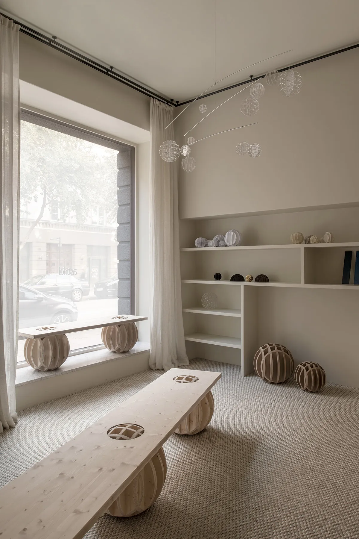 The sculptural furniture features horizontal planes that delicately balance on latticed spheres, offering a captivating interplay between weight and lightness, solidity and layering of planar surfaces.