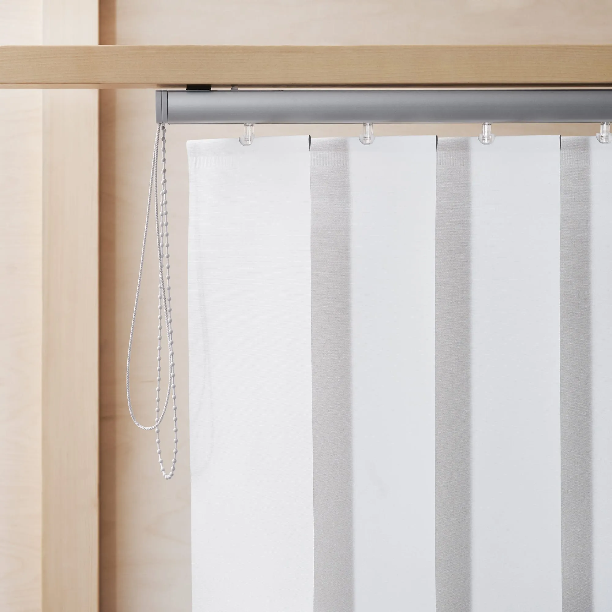 System R is based on 250mm wide vertical slats and shares components with Ann Idstein’s regular Vertical Blinds in 89mm and 127mm widths. The slat width selection accommodates different fitting situations. The 250mm wide System R slats can be equipped with wooden slats applied horizontally on top of fabric, available in solid wood types and lacquered finishes in multiple colors.