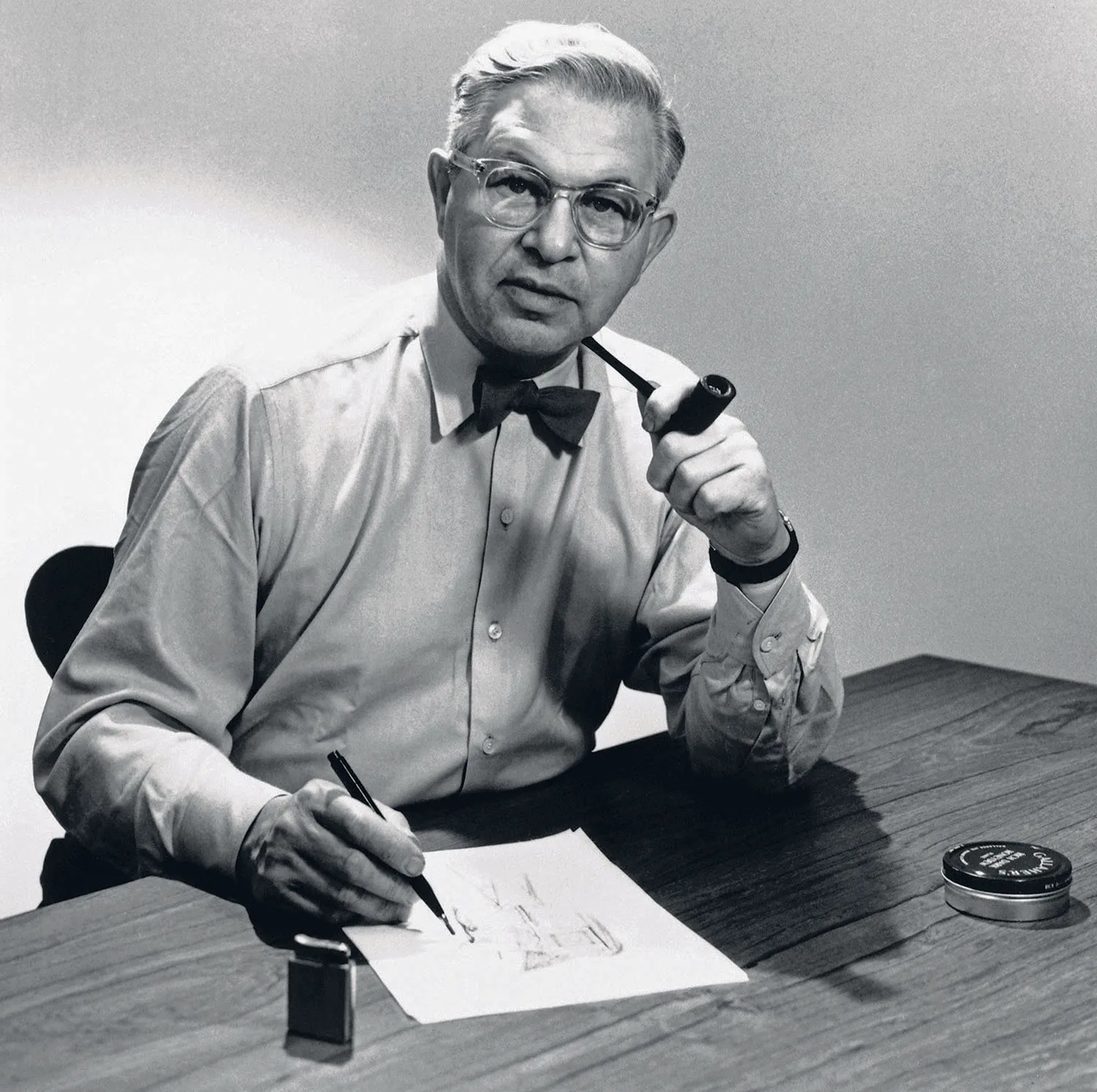 Arne Jacobsen was a notoriously difficult man to work with, sarcastic and demanding, and even requiring his own staff to work around the clock rather than tend to their families. At home, he lined his cups and glasses in neat rows and ensured the children’s toys were stored out of sight. While redecorating, he had his family hold up picture frames for hours on end to make sure the final composition was just right. Yet despite his peculiarities, Jacobsen was a well-rounded individual who enjoyed painting, studying nature and tending to saplings. He had a warm, self-depreciating sense of humour evident in his hand-drawn Christmas cards to close friends or his carefully considered statements on subjects close to his heart. As a child, he liked to play the clown and throughout adulthood he continued his boyhood antics – once donning a hollowed-out melon as a hat. Oftentimes Jacobsen looked to escape the very thing he had helped to create: “I am choking on aesthetics,” he would say in private, where even the pastries he ate had to look as good as they tasted. Little wonder, then, that he often sought joy and comfort in places where anti-design and anti-aesthetics ruled. His legacy – as a pioneering and uncompromising modernist designer and a nature-loving, affable family man – reflects his complex nature.