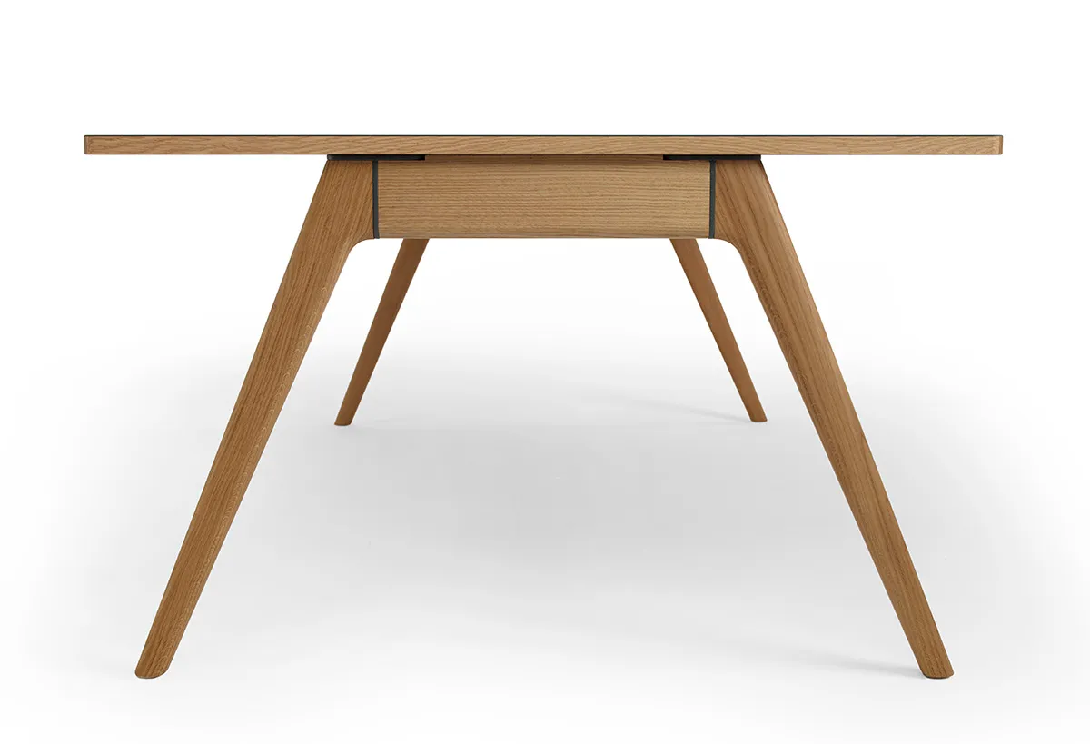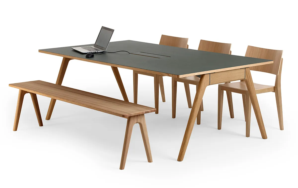 Arko Table represents the optimal narrow table solution at standard height of 730mm. Starting from 1400mm length accommodating two people per long side, it extends up to 2400mm for four people, making it perfect for meeting rooms and collaborative workspaces.