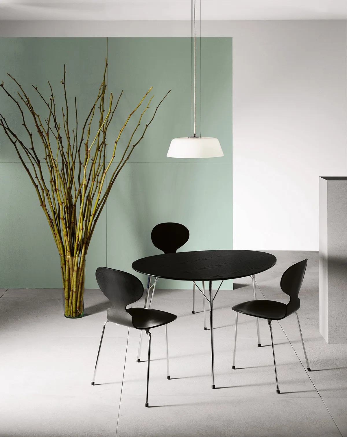 The same year Arne Jacobsen designed the Ant – in 1952 he also designed a small egg-shaped table for the chair. This would turn out to be his most unique table design obviously with three legs like his favourite chair the Ant. The table is light and elegant design with the distinctive egg-shaped black lazured table top and is a perfect match for the minimalist Ants. In contrast to the Ant the table was only in production from 1952-1960.