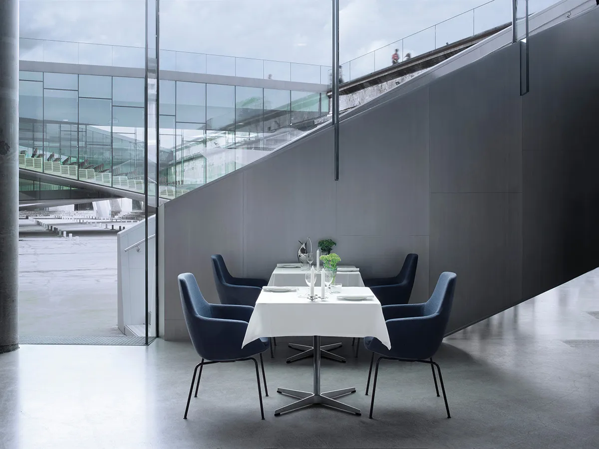 During the development of the iconic Giraffe chair for the hotel’s restaurant, Jacobsen’s team at Fritz Hansen created multiple prototypes exploring different design directions. Little Giraffe™ featured a lower, more discrete backrest compared to the high-backed version that was ultimately selected for the hotel project.