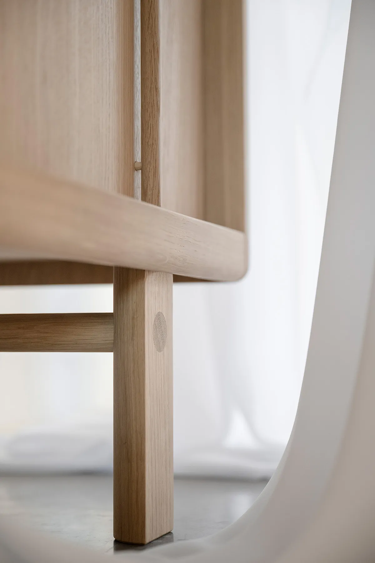 The storage furniture is created with a focus on both functionality and tactility. The sliding doors slide effortlessly aside using a solid wood round cane handle – a handle that is not only practical, but also provides a subtle, sensuous grip that you want to touch. The top plate is beautifully framed by the sides of the furniture, which both protects and frames the objects you choose to place there. The frame also allows for material contrasts and colour choices that can be adapted to the room and mood.