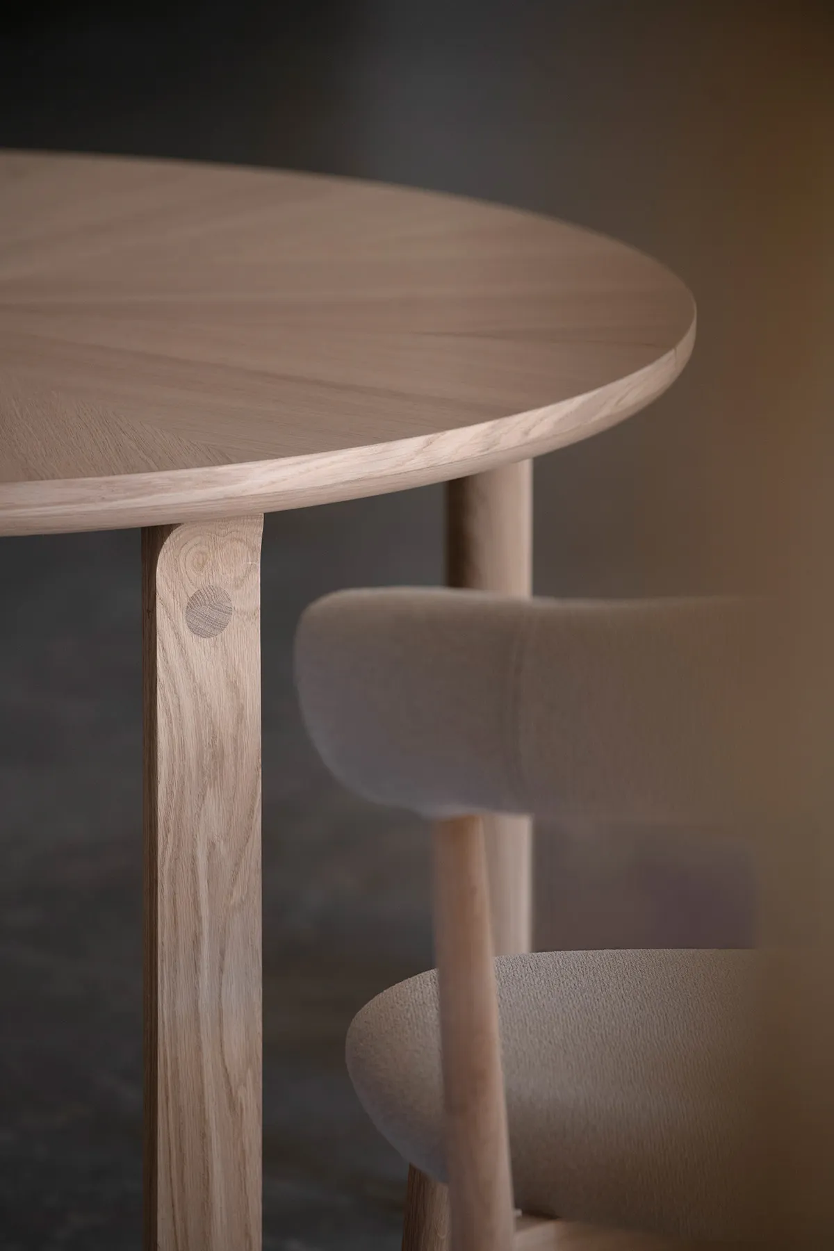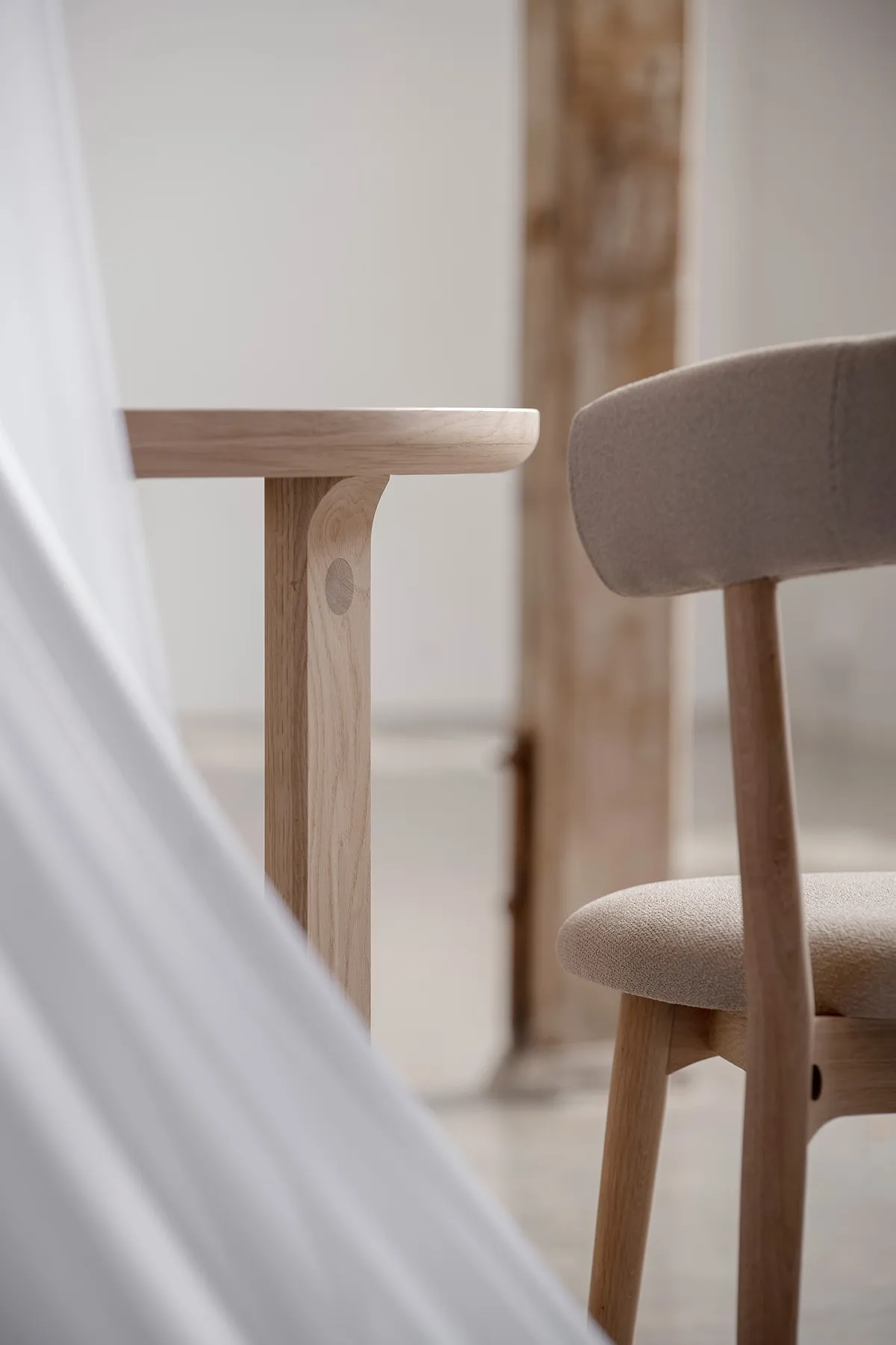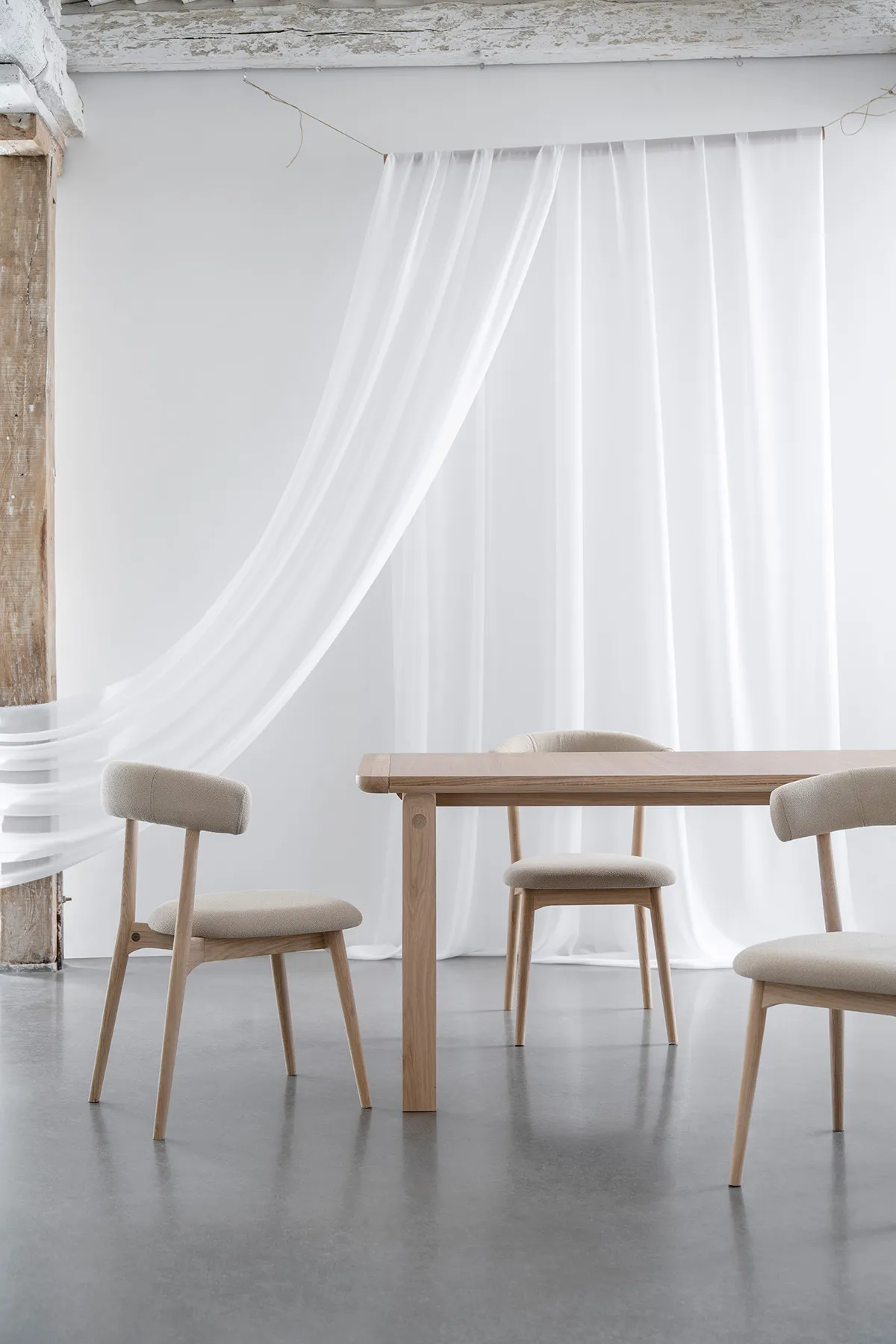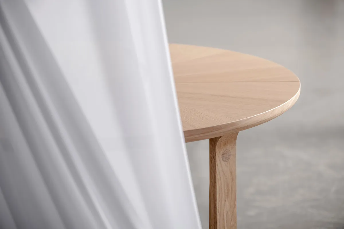 In the rectangular tables, I have worked to make the pull-out function itself an integrated and aesthetic part of the design. The pull-out is not hidden, but rather emphasised as a beautiful and natural component in the geometry of the table. This creates an elegant visibility of the function – a kind of honest gesture that emphasises the flexibility of the furniture without compromising the visual expression.