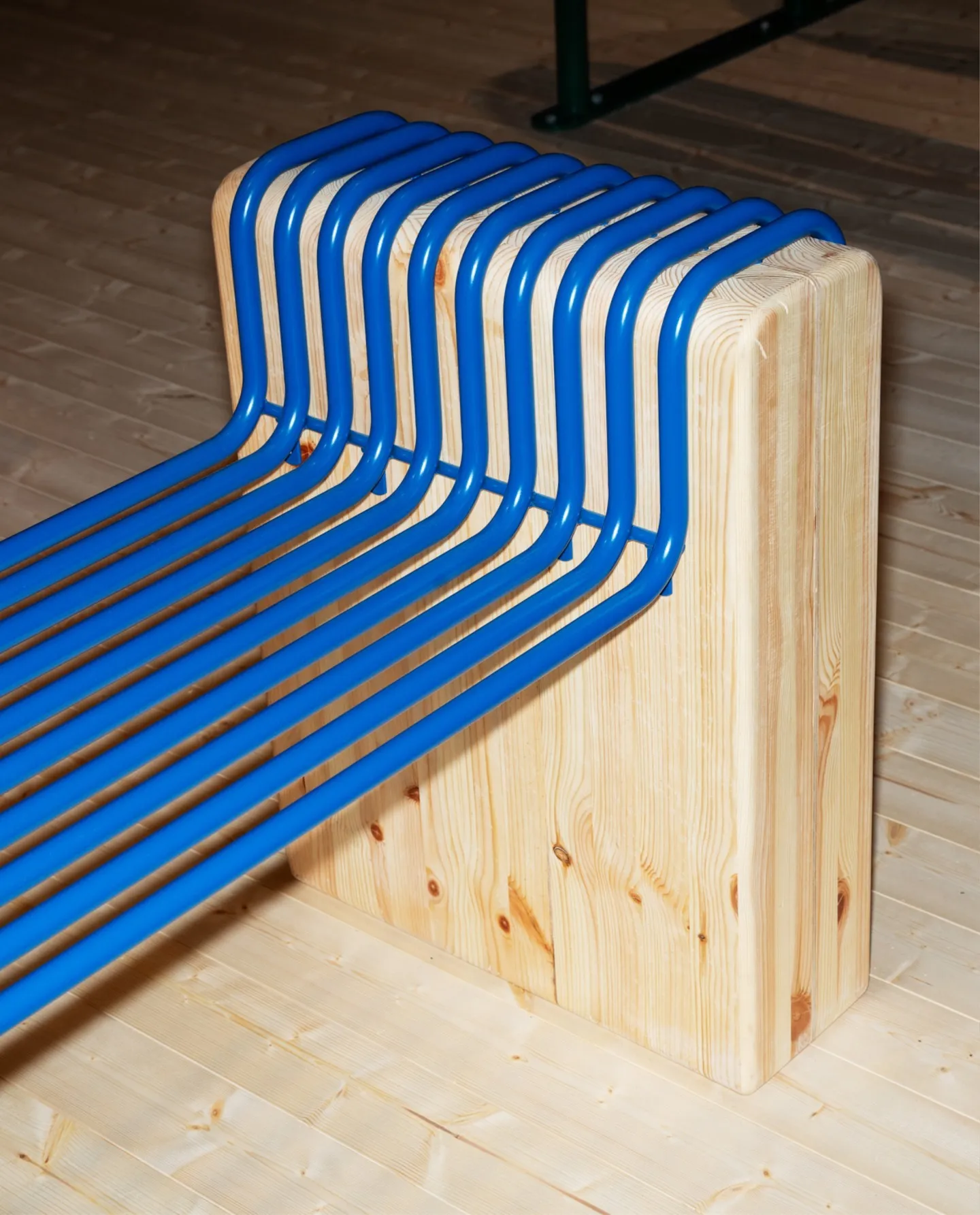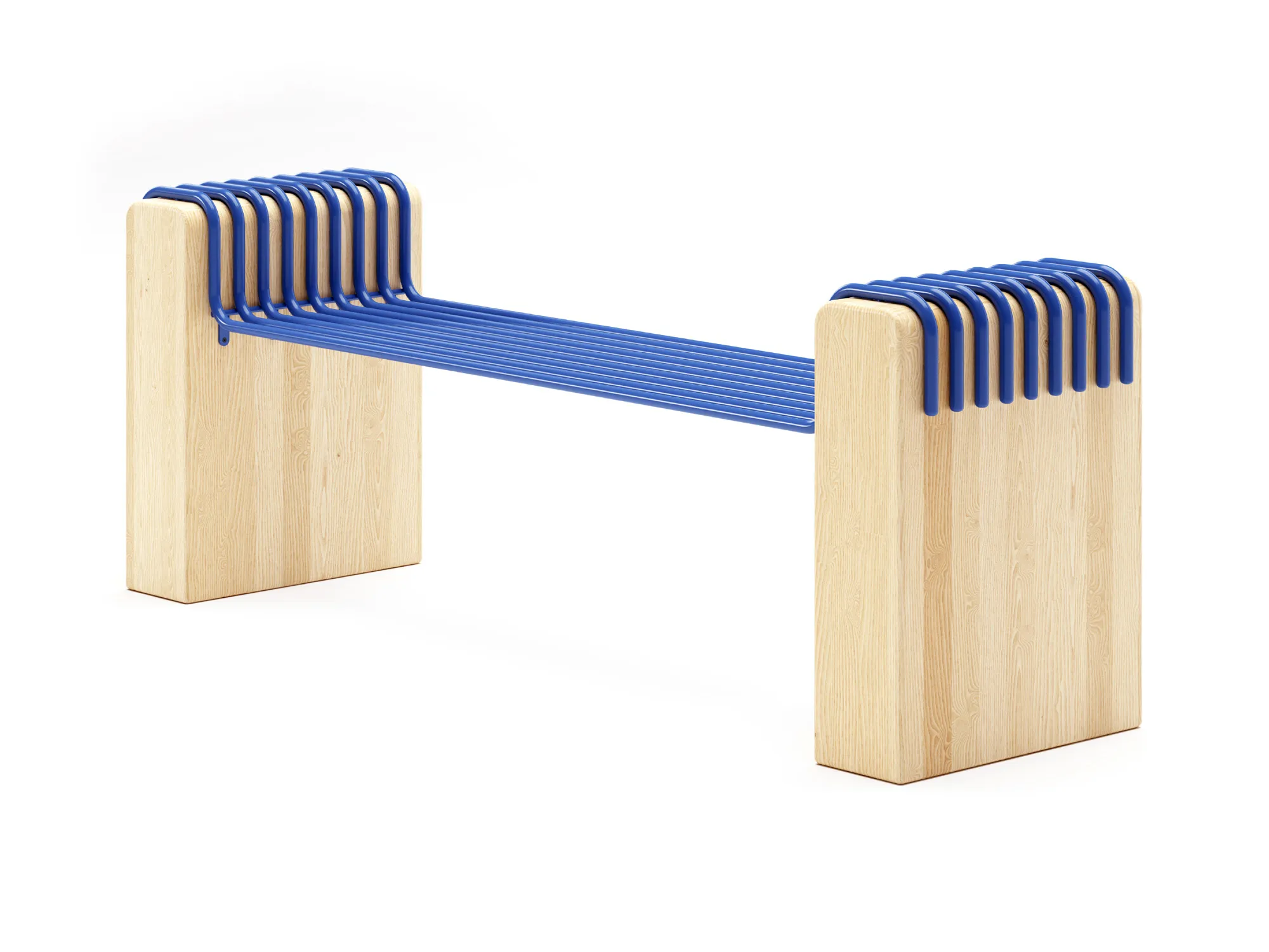 Aros is a bench designed to bring color and playfulness to public spaces. With its distinctive form, it is an ideal addition to locations such as train stations and platforms, where concrete often dominates. Crafted from wood and steel, Aros features a sculptural steel frame that elegantly drapes over the wooden side panels to create a striking seating experience.