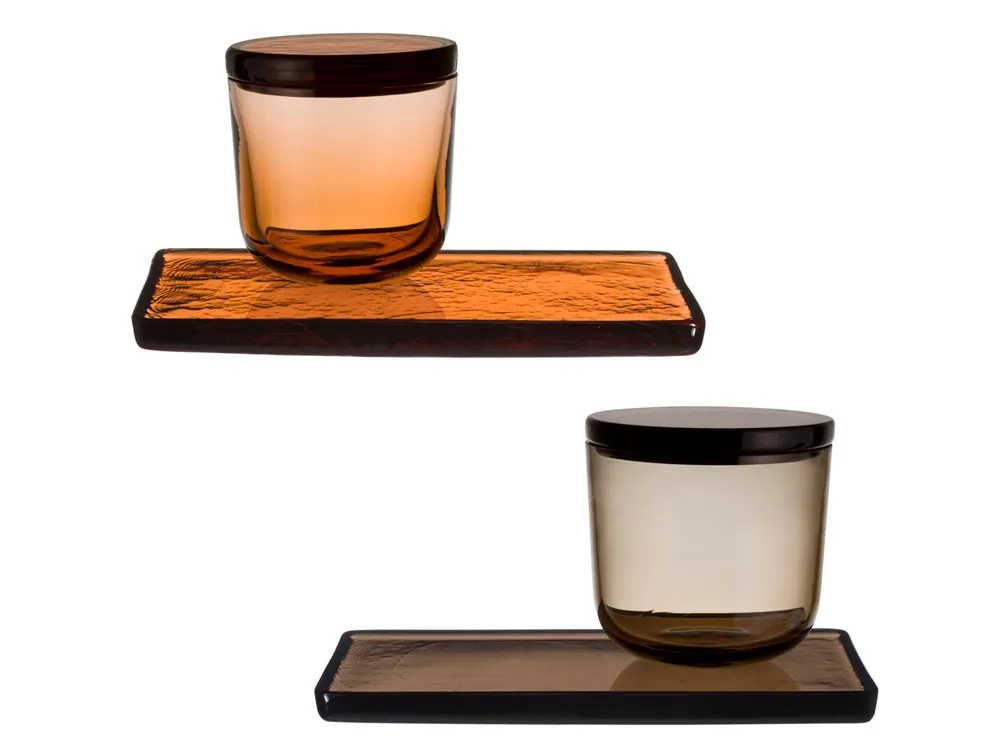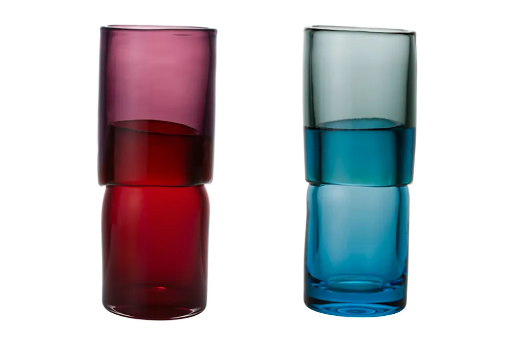 Koskinen has named the cylindrical, two-colour pieces Kohta/ Section. The name refers to the production method which draws on the centuries-old incalmo technique, developed by Italian master glassblowers to create bands of colour. Koskinen’s Kohta design features two cylindrical sections of different-coloured glass fitted into each other, which create a third colour where they join.