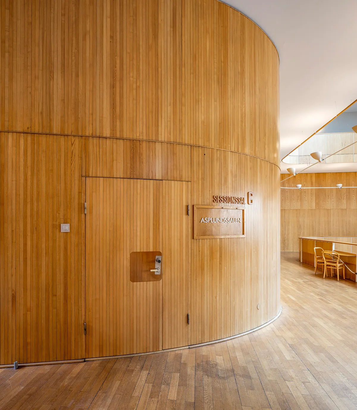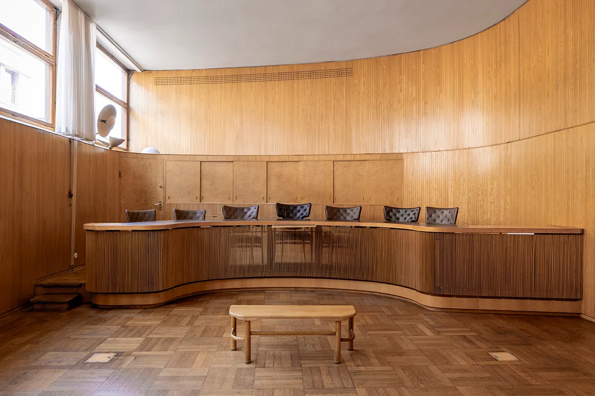 During the 1930s, attitudes toward law and justice began to shift, with a more humane view on crime emerging. Legal institutions were expected to focus on correction and rehabilitation rather than punishment. Influenced by these ideas, Asplund designed the Town Hall interior with soft shapes and natural light to inspire hope in the accused.