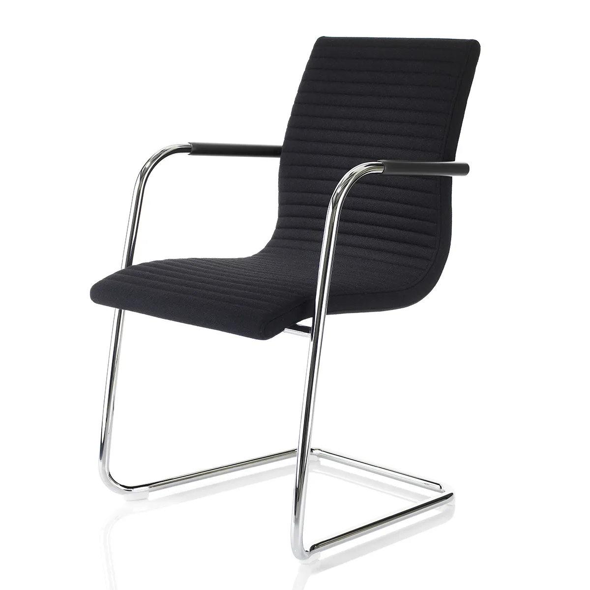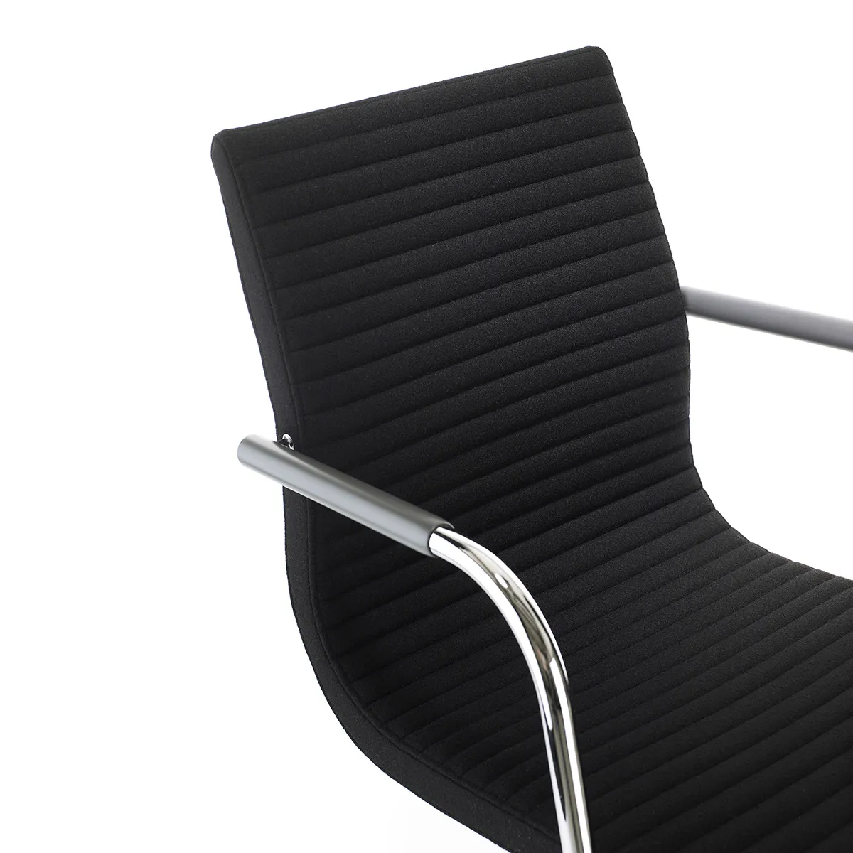 The soft lines of the seat shell carry over to the newly designed base in which a single steel tube forms both the base and the arms. The sled base gives the chair an entirely new expression and is available in chrome or powder coat.