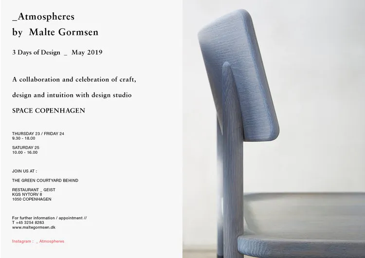 For 3 Days of Design, Space Copenhagen and Malte Gormsen present the exhibition _Atmospheres in a new showroom setting in the inner part of Copenhagen City, premiering The Holmen collection along with a selection of unique bespoke pieces celebrating handcrafted furniture making at its finest.
