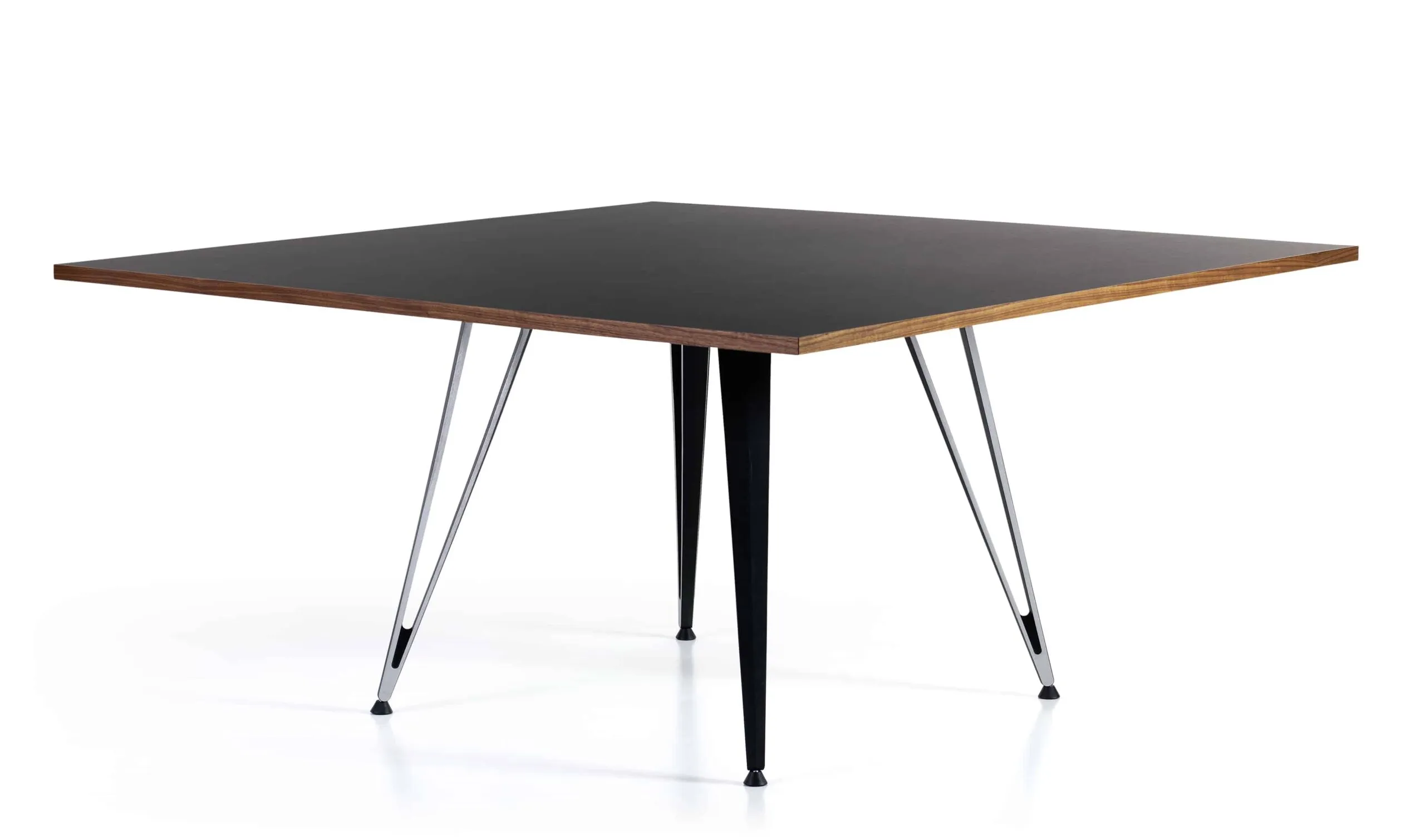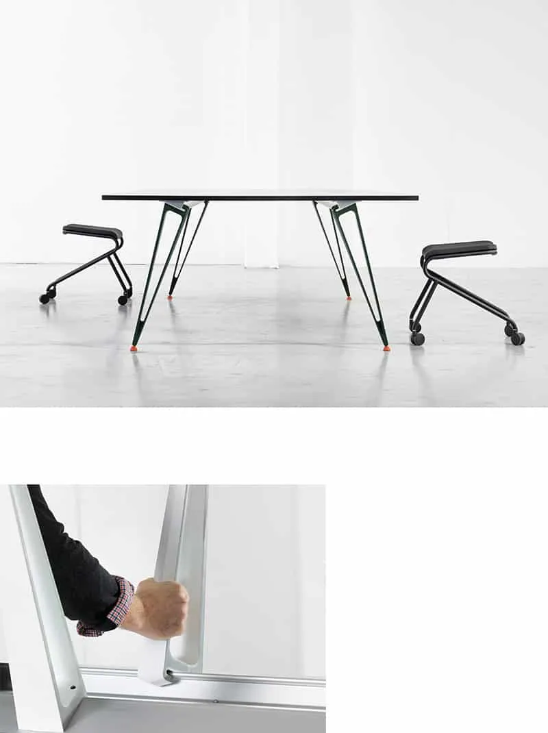 The Attach table series brings the simpli ed principles of basic physics to the function of table construction. Sleek extruded aluminum beams and structural extruded aluminum legs are linked under the table and secured by gravity. Technology marries art in the construction of this impressive new series of tables.