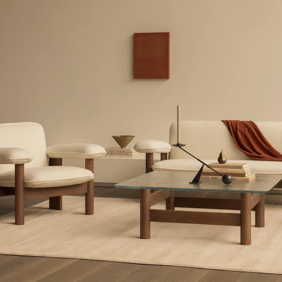 The Brasilia Lounge Table complements these seating options, making a striking statement whether paired with the table, chairs and sofa or used independently. Its fused, tempered opti-white glass tabletop creates a light expression and rounded corners ensure a streamlined look, melding perfectly with the subtly curved solid wood base, available in three wood types.