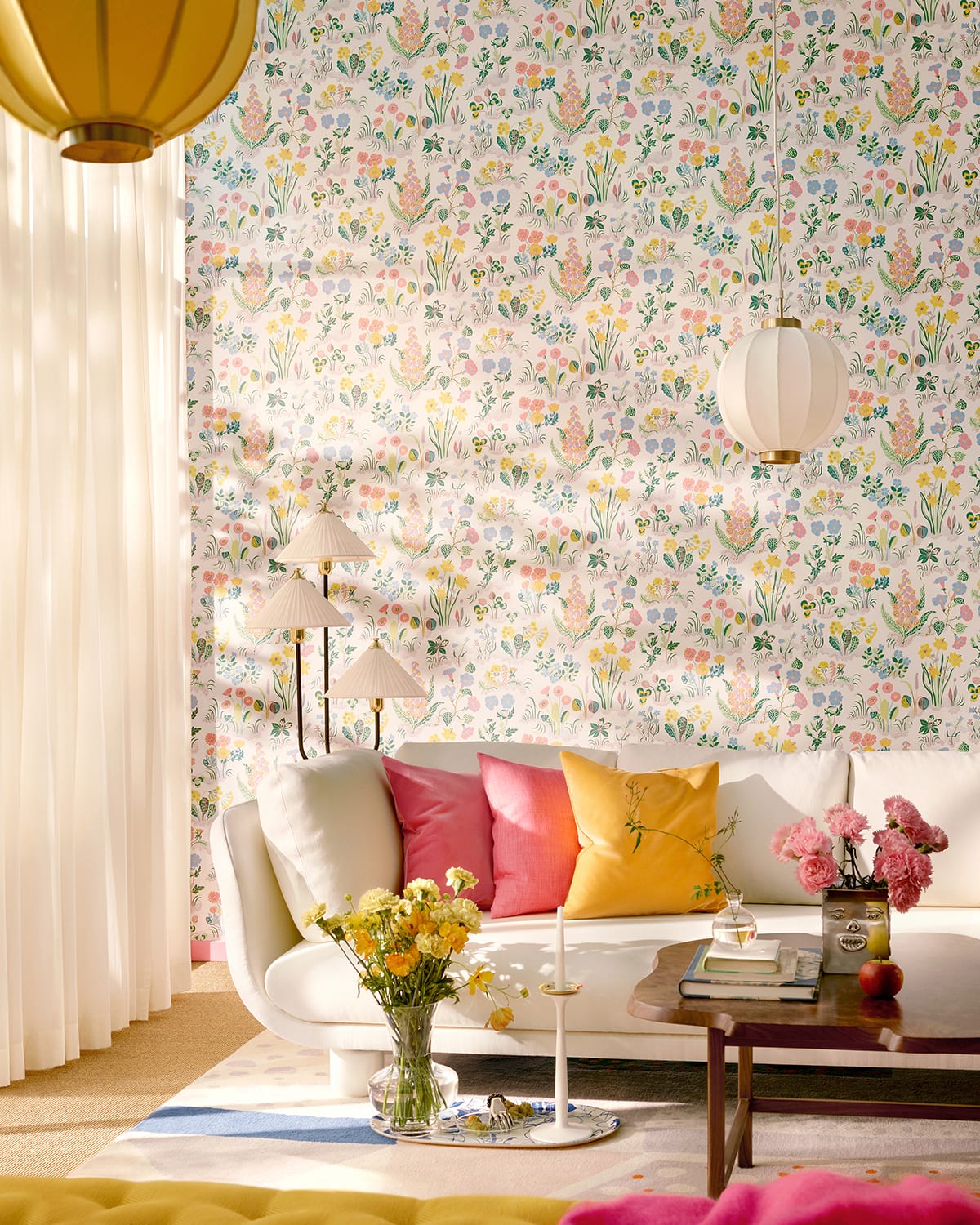 With their pink, blue and violet tones, reminiscent of a shimmering morning light, the flowers unite in the Aurora wallpaper, designed by Josef Frank in 1947.